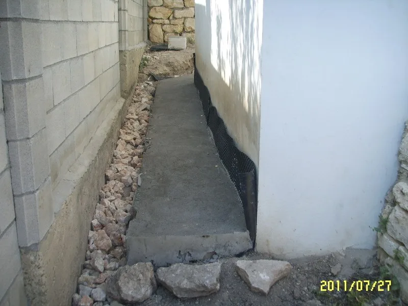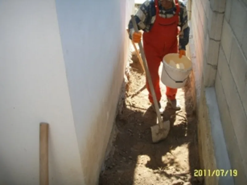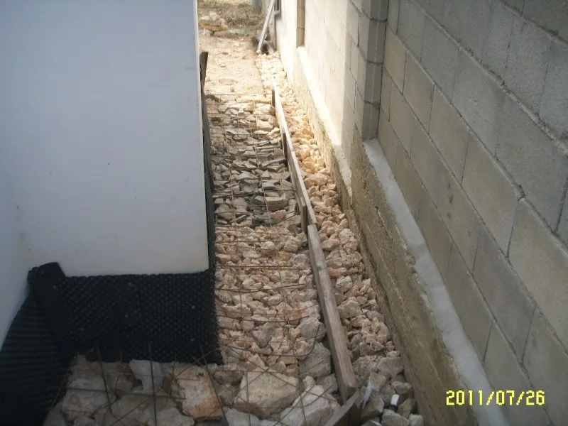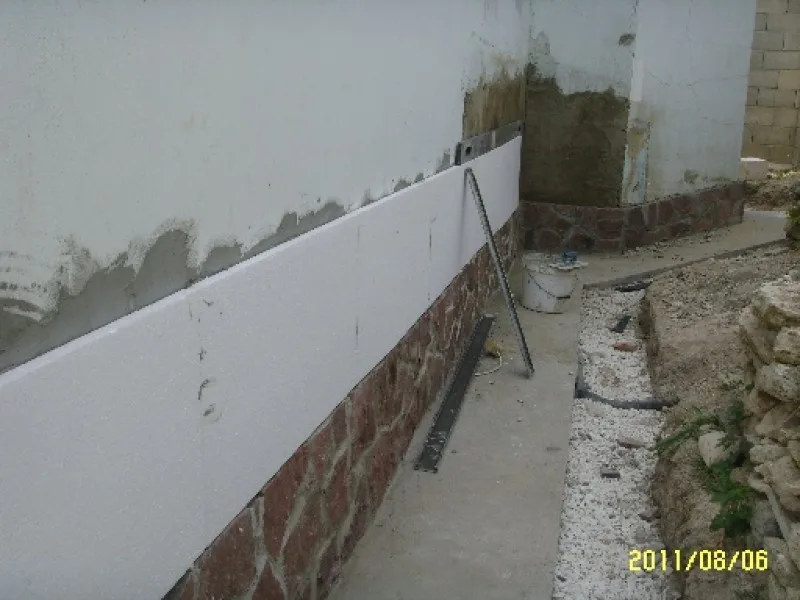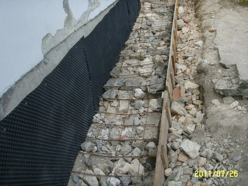 Дренажът е покрит с чакъл и е поставена армировка. Следващата стъпка е да се излее бетона. Преди да облепим цокъла поставяме хидроизолация на стената, където ще бъде поставен той.