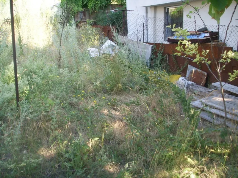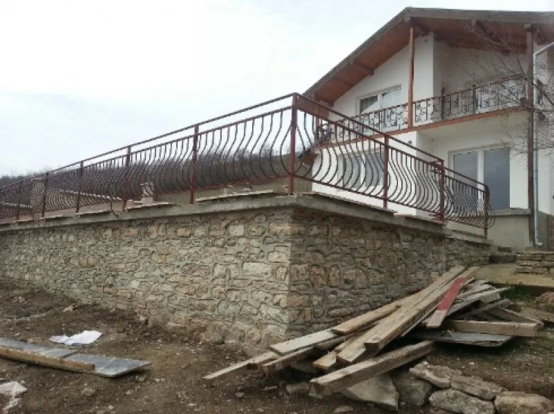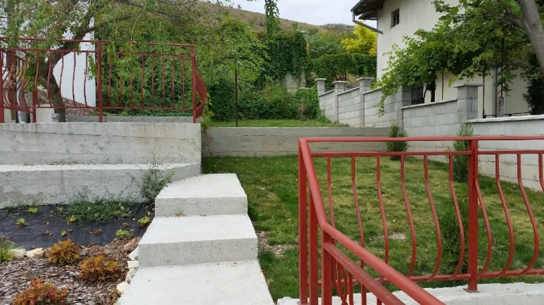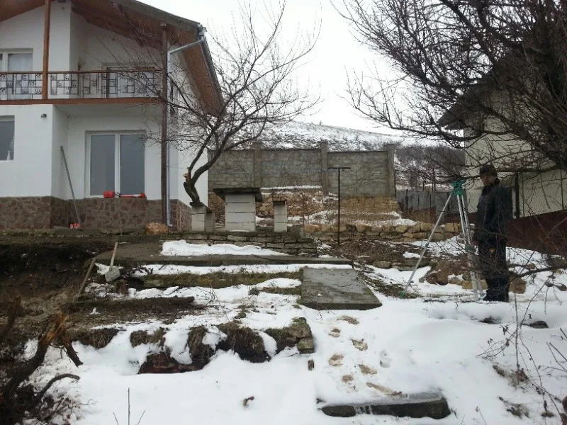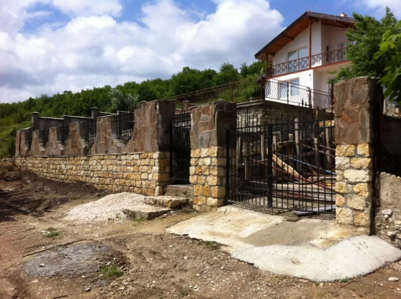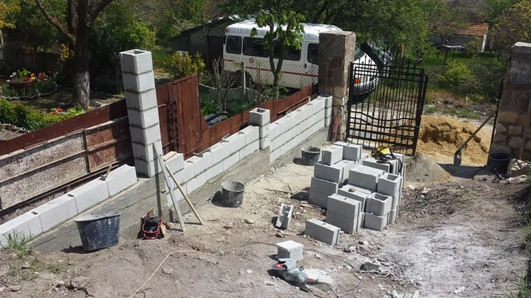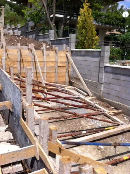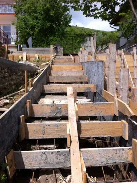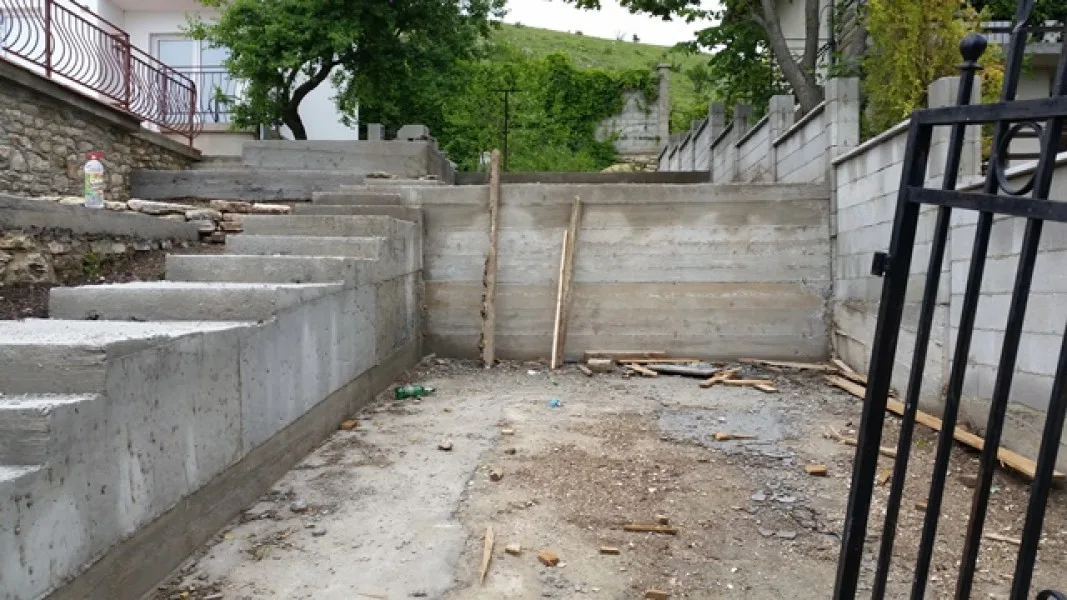 Започнаха строителните работи в другата част на парцела. Нашите строители изграждат оградата. Кофражът на стълбите и на паркомястото е поставен. Предстои изливането на бетона. Доставени и монтирани са нови метални порти към къщата и гаража.