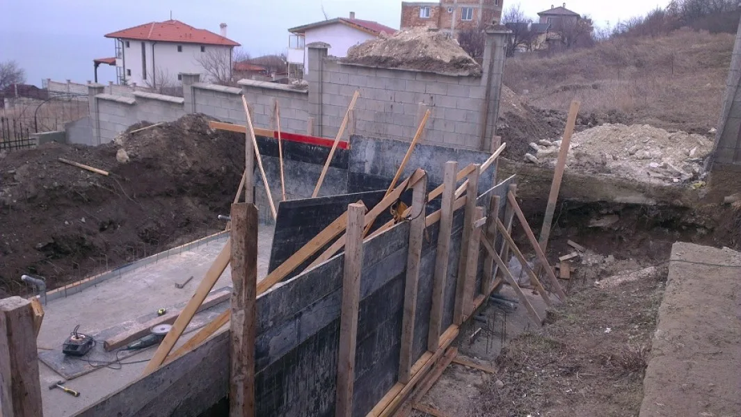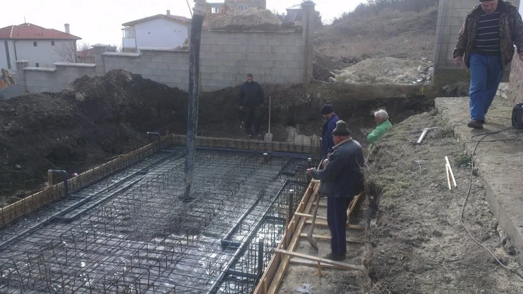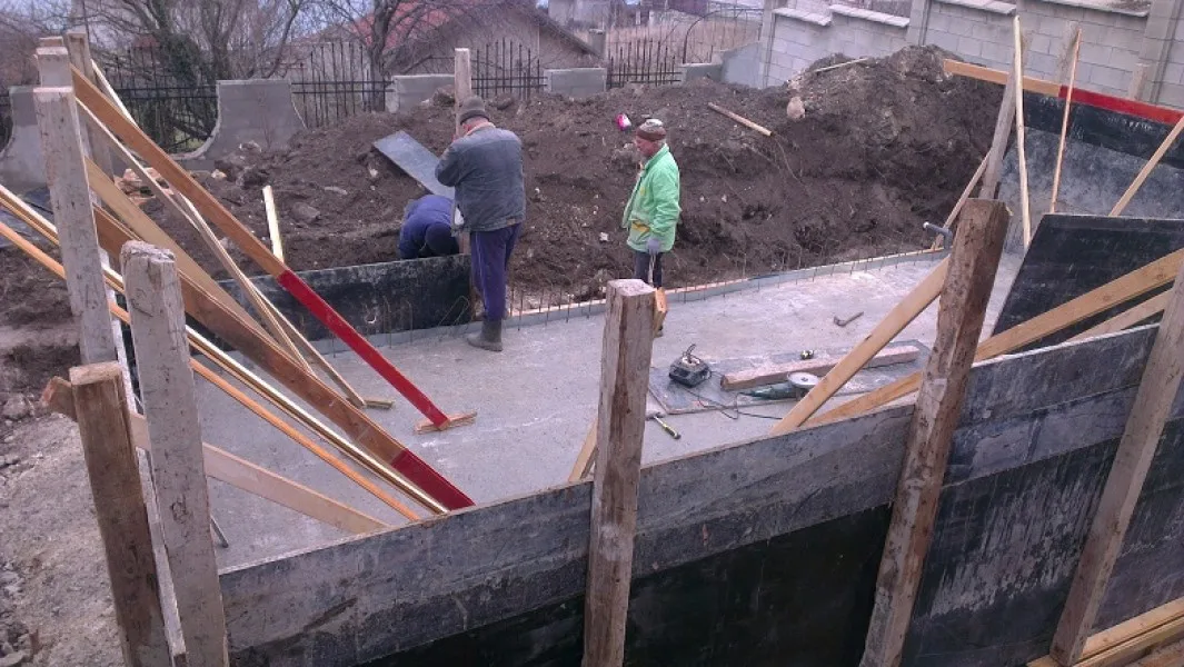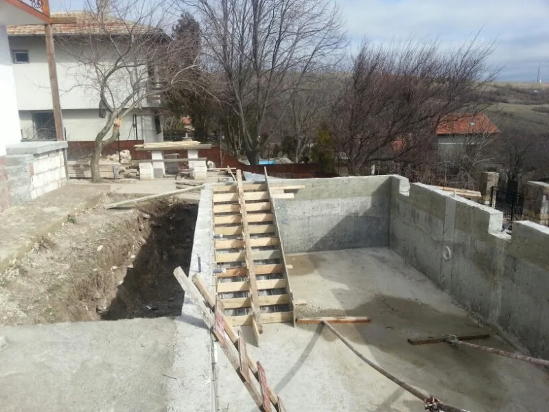 През януари 2013 г. започнахме изграждането на плувния басейн в имота. Започнахме с изкопните работи, след което изляхме бетона за основата и поставихме кофража за стените на басейна.