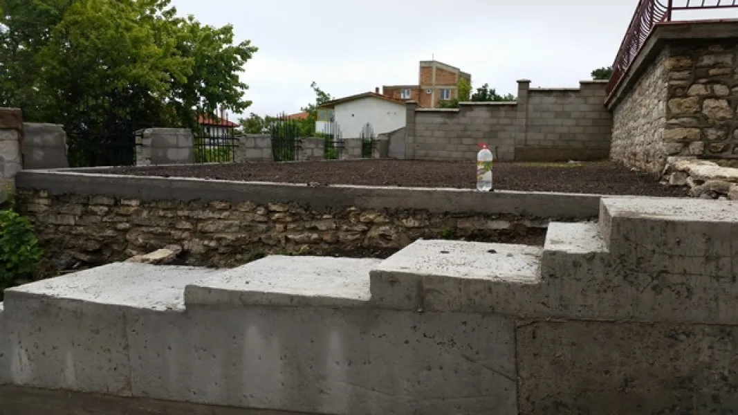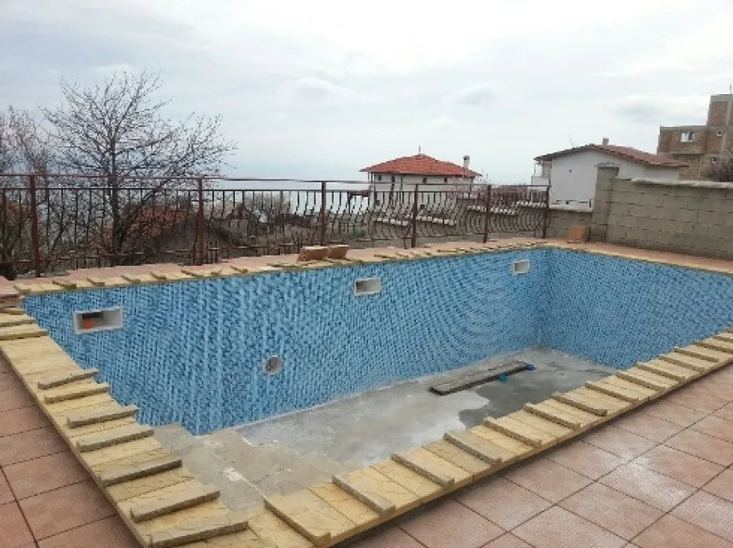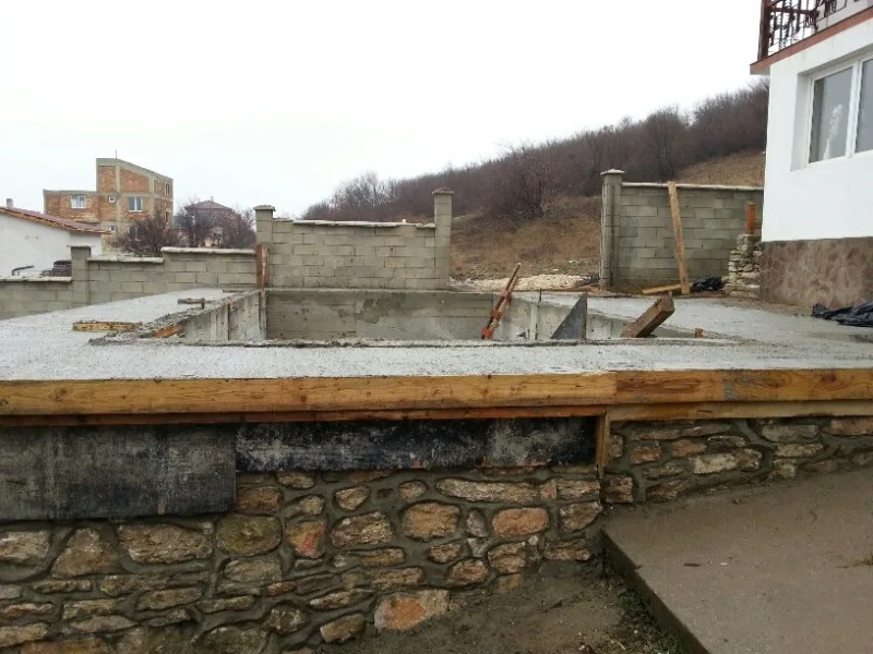 Грубият строеж на басейна е завършен. Басейнът ще има вътрешна стълба, кофража и армировката на която, вече са готови. Помпеното помещение на басейна също се оформя. Поставянето на камък на подпорните стени е в ход. Външното стълбище също е готово.