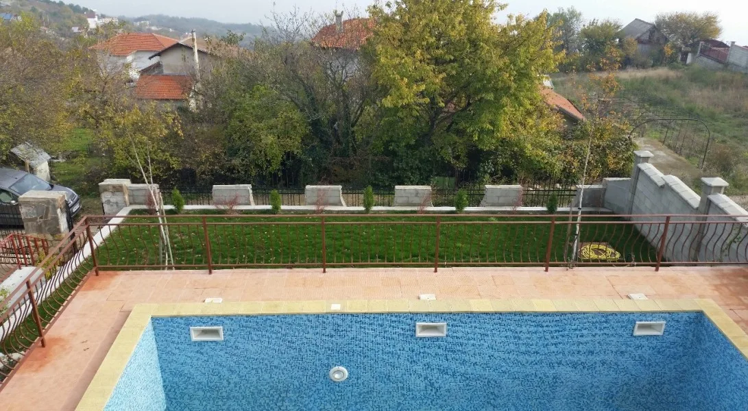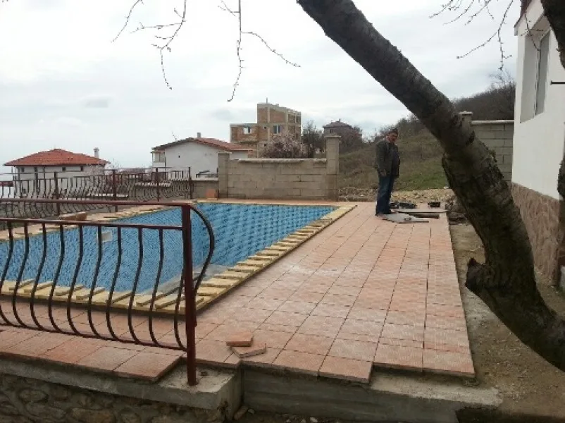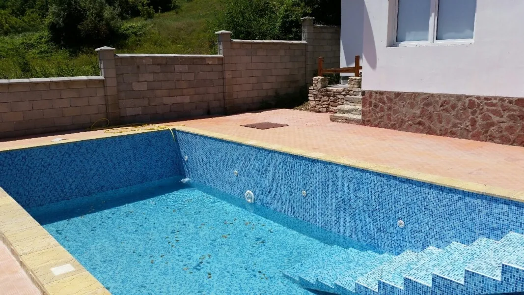 Вертикалната планировка и паркомястото са готови. Филтриращата и помпена системи на басейна са монтирани. Проектът е към края си.