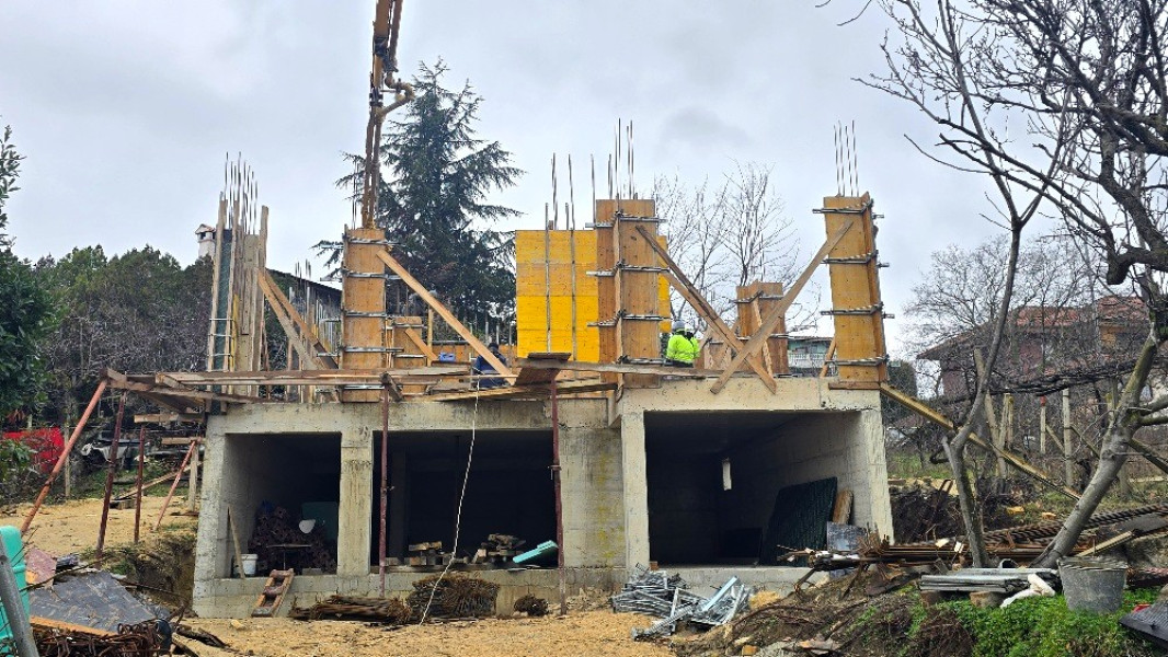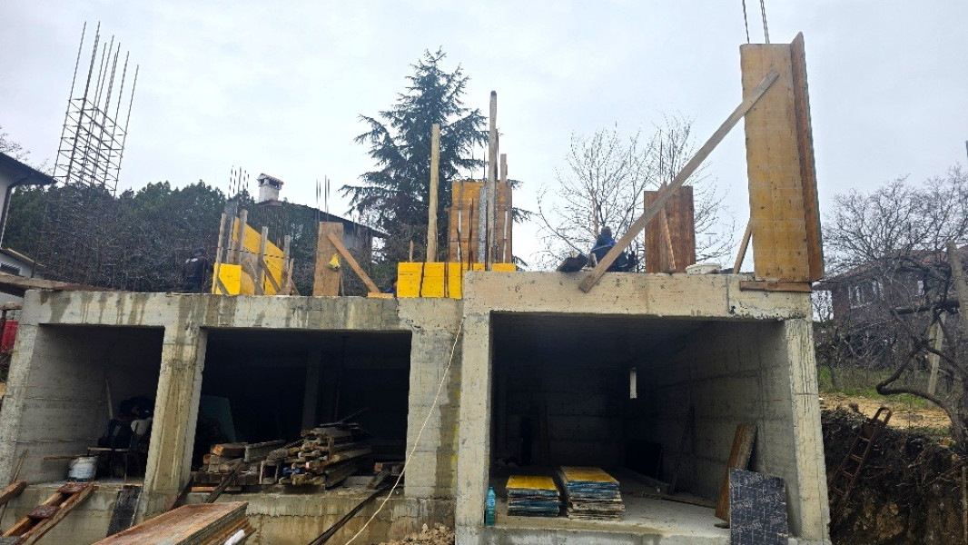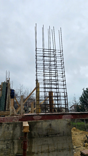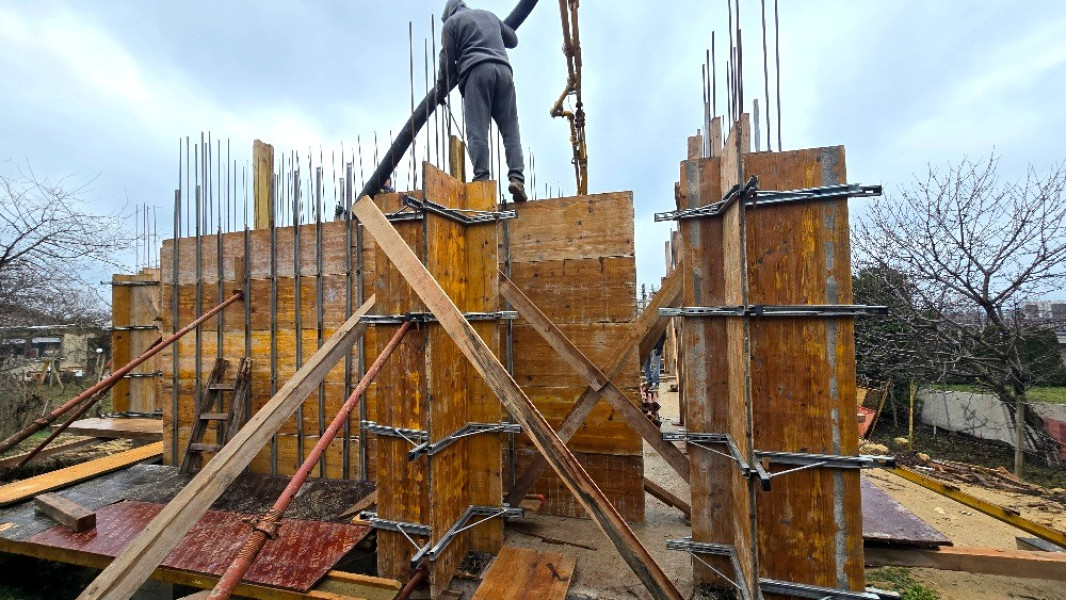 Das Bauunternehmen Varaks setzt den Rohbau eines Einfamilienhauses in Varna mit dem Einbau von Schalung, Bewehrung und Betonarbeiten fort. Die Schalung für die erdbebensicheren Wände und Säulen wurde entsprechend der Bauplanung hergestellt. Die Bauarbeiter nivellieren und verstärken die Schalungsplatten sorgfältig und behandeln sie anschließend mit Schalungsöl, um eine hochwertige Demontage zu gewährleisten. Die Bewehrung für die Säulen und Wände wurde angebracht und der Beton gegossen.