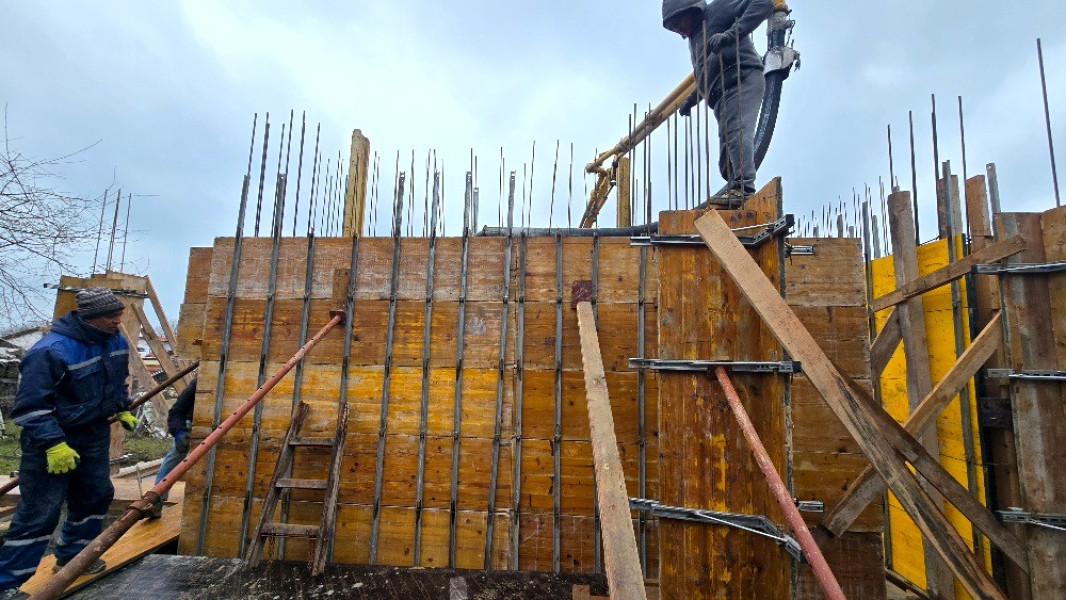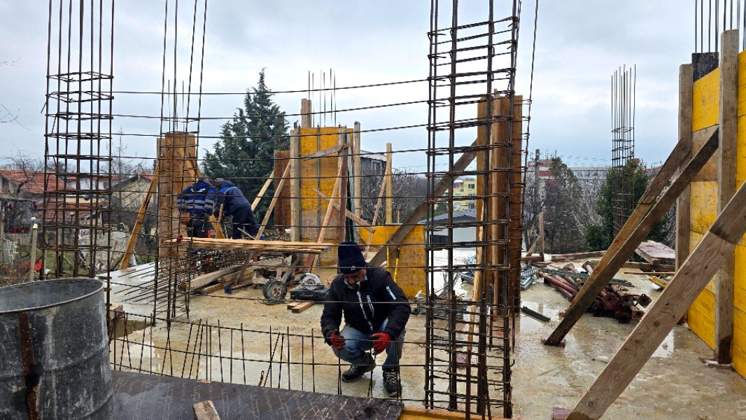 Die Bauarbeiten am zweiten Teil dieses Hauses in Varna werden mit dem Bau von Stahlbetonwänden bis zur Höhe 0 fortgesetzt. Nach dem Bau der Wände stellen die Bauarbeiter die Schalung und die Bewehrung für die Bodenplatte auf Höhe ±0,00 her. Danach wird der Beton gegossen, der die Strukturplatte vervollständigt und sie für die nächsten Bauabschnitte vorbereitet.