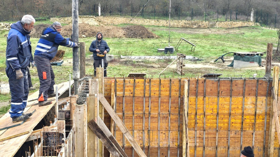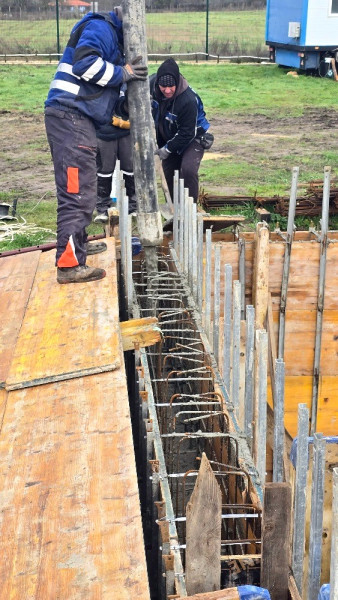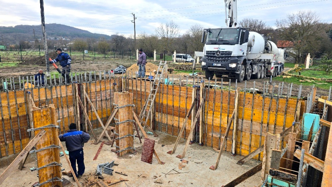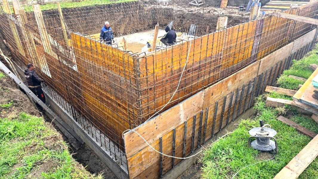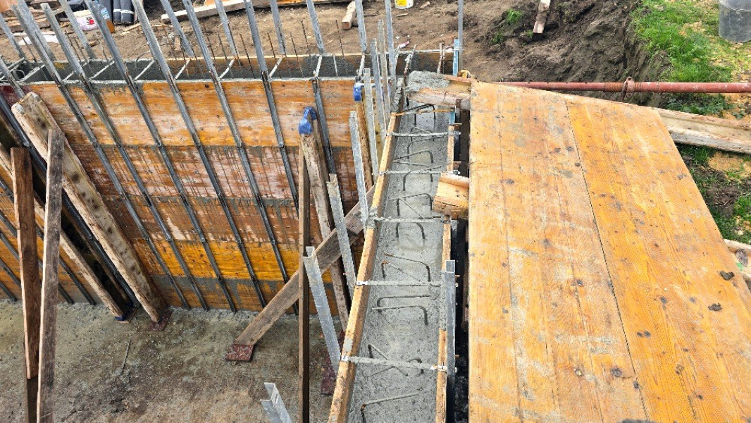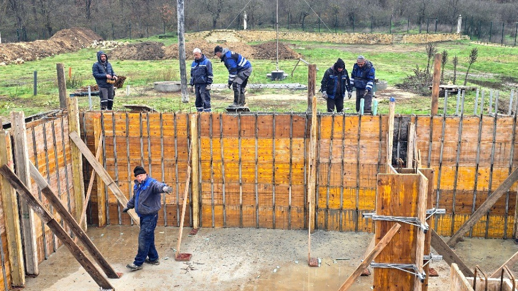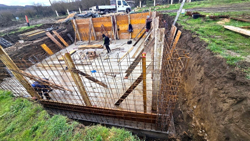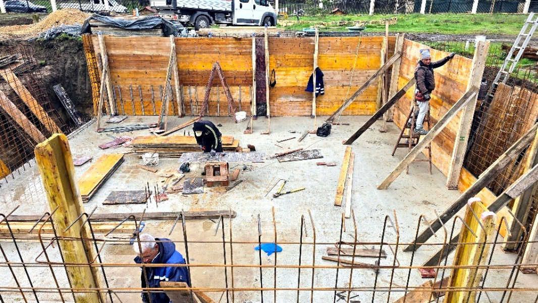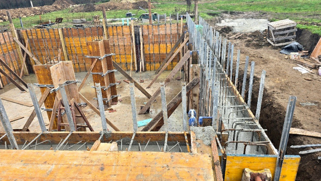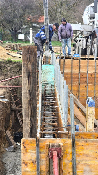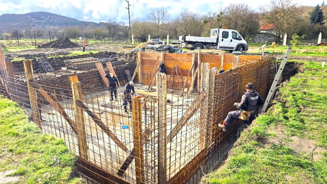 Das Bauunternehmen Varaks setzt die Bauarbeiten an diesem Haus in Dolishte mit dem Einbau der Wandbewehrung bis zur Höhe +0,00 fort. Die Schalung ist ebenfalls fertiggestellt, danach wird der Konstruktionsbeton gegossen, verdichtet und ausgehärtet. An den im Projekt vorgesehenen Stellen bringen die Bauarbeiter Stahlbetonstützen an.