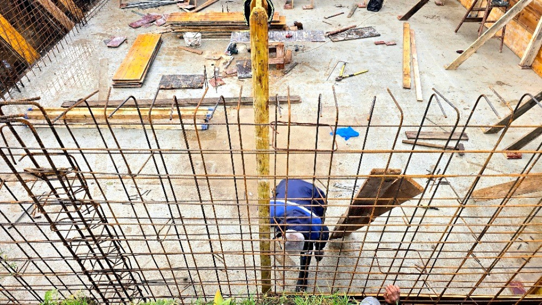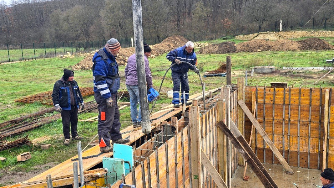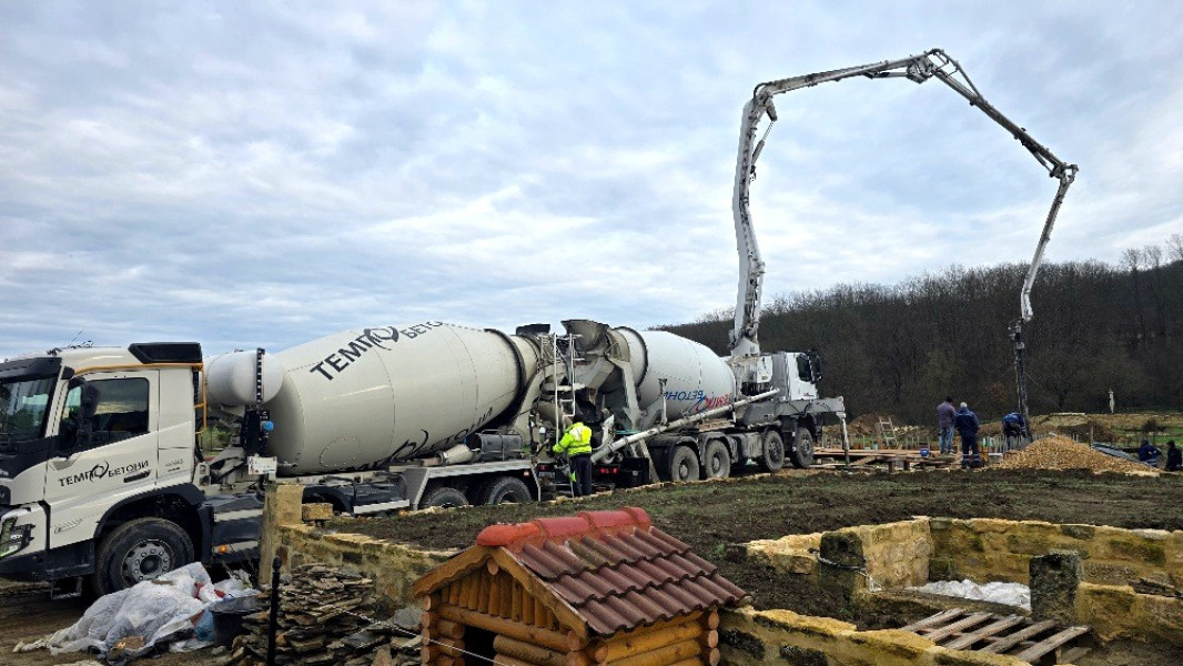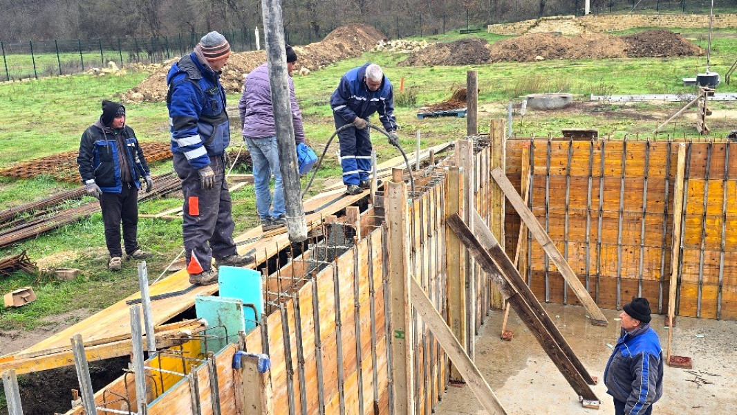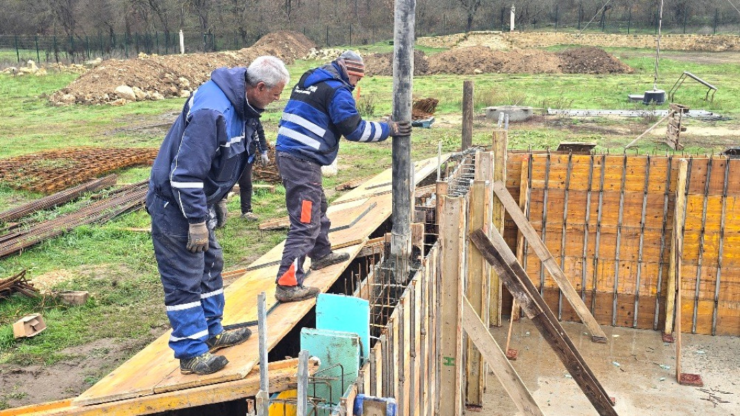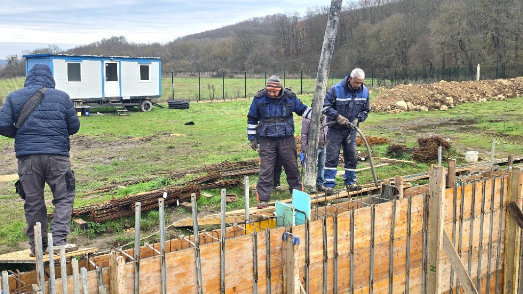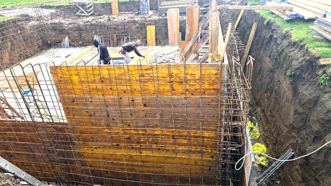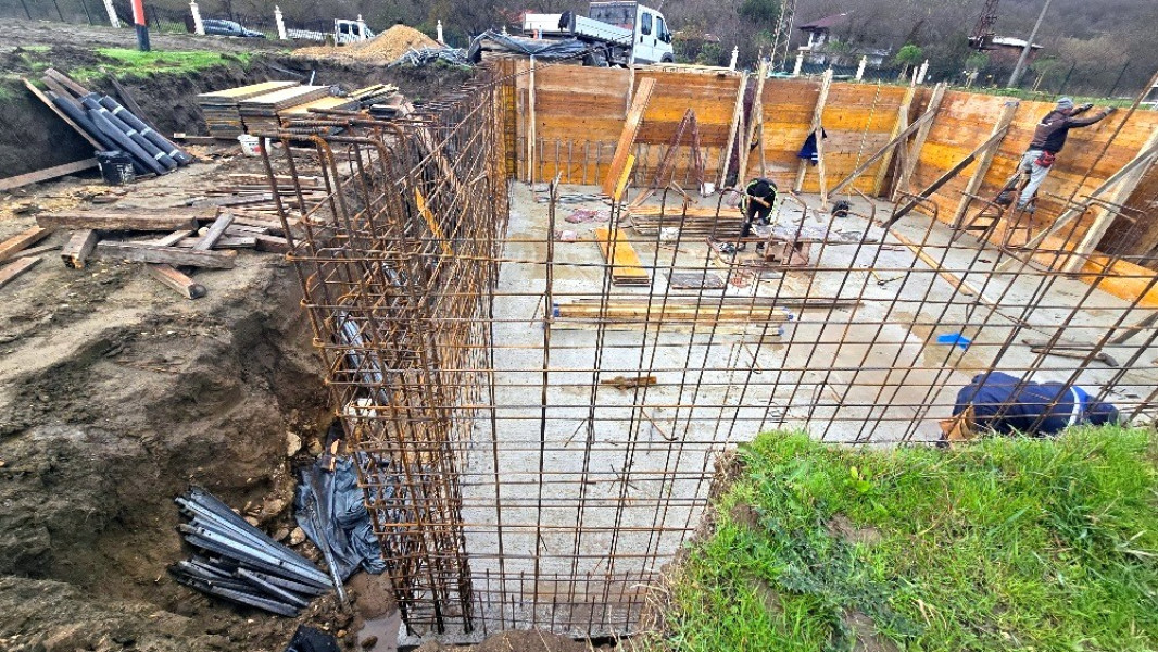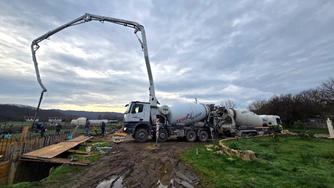 Das Bauunternehmen Varaks setzt die Bauarbeiten an diesem Haus in Dolishte mit dem Einbau der Wandbewehrung bis zur Höhe +0,00 fort. Die Schalung ist ebenfalls fertiggestellt, danach wird der Konstruktionsbeton gegossen, verdichtet und ausgehärtet. An den im Projekt vorgesehenen Stellen bringen die Bauarbeiter Stahlbetonstützen an.