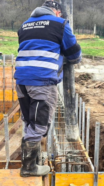 Das Bauunternehmen Varaks hat mit den Bauarbeiten an diesem Haus in Varna begonnen, indem es das Gebäude gezeichnet hat. Die Bauarbeiter setzen die Niveaus fest und legen die Neigung fest. Dann beginnen die Aushubarbeiten. Der erste Betonsockel wurde gegossen. Nach dem Betonsockel wurde eine Bitumengrundierung für die Abdichtung aufgetragen.