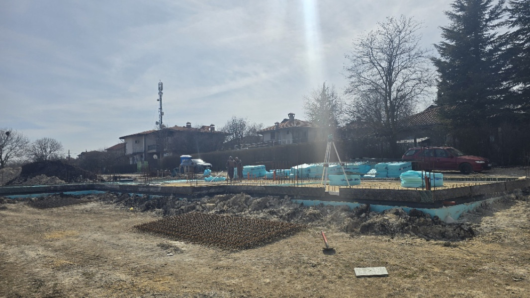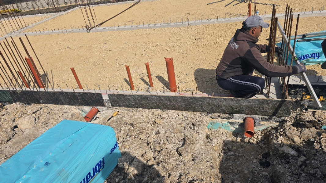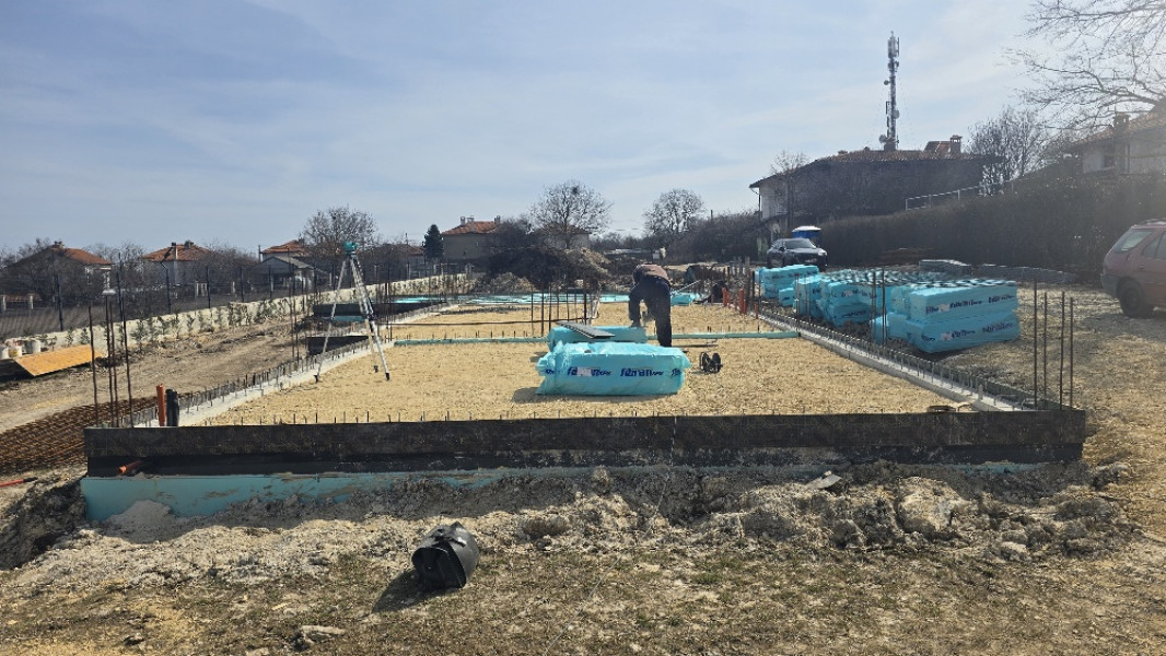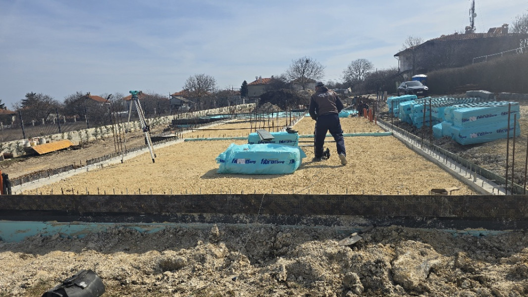 Die Bauarbeiten am Rohbau des Hauses in Varna, die von der Baufirma Varaks durchgeführt werden, werden mit der Verlegung der Abdichtung im Fundament fortgesetzt. Die Bauarbeiter beginnen mit der Verlegung einer Bitumengrundierung in den Fundamenten. Dann wurden 2 Schichten einer aufbrennbaren Abdichtung aufgebracht. Auch die Wärmedämmung Fibran wurde in den Fundamenten angebracht. Sie verringert den Wärmeverlust und ist für feuchte Räume geeignet.