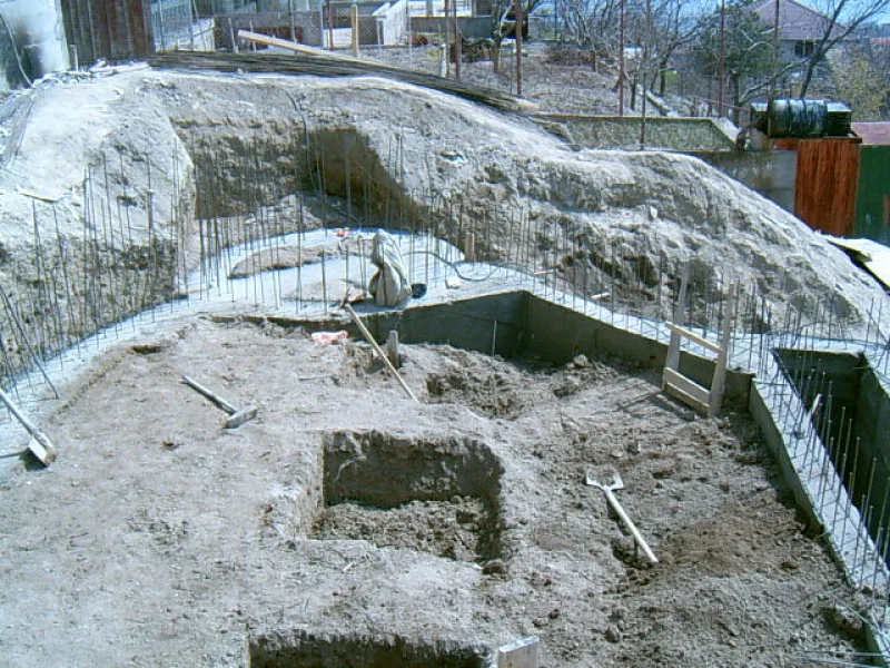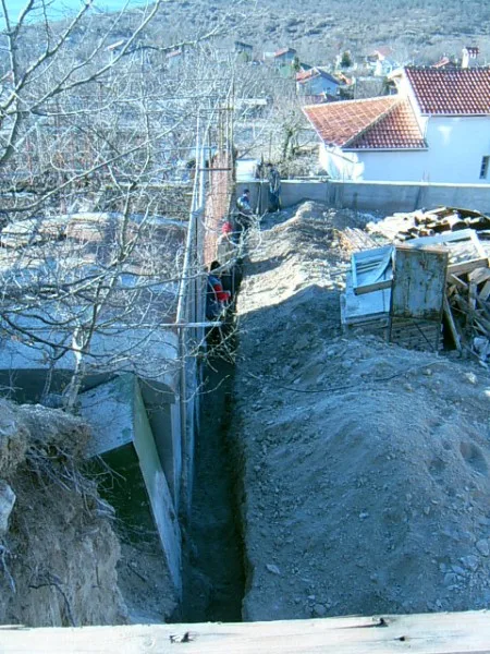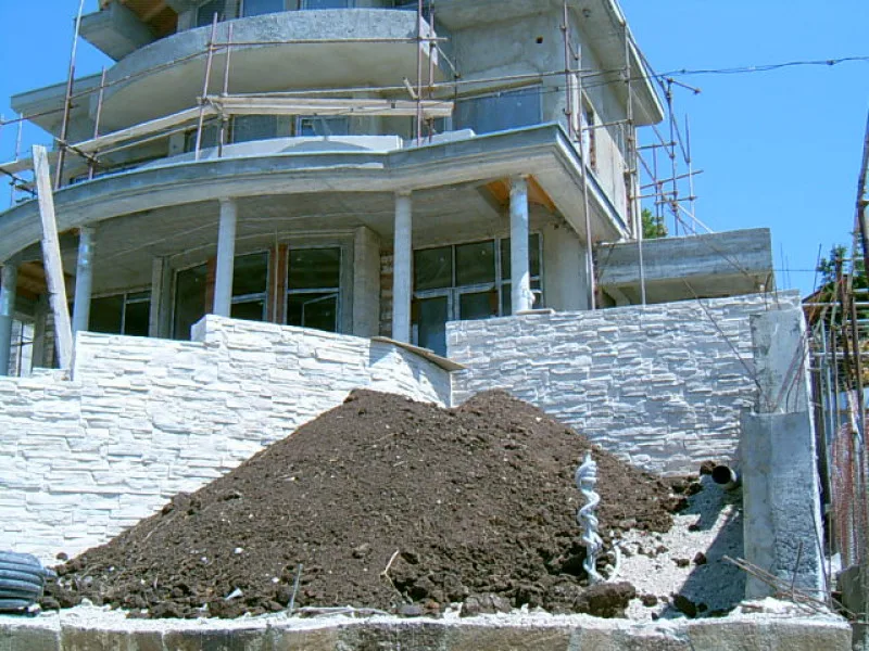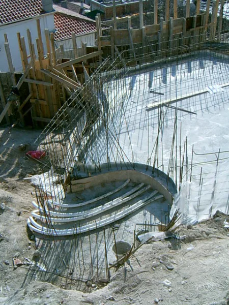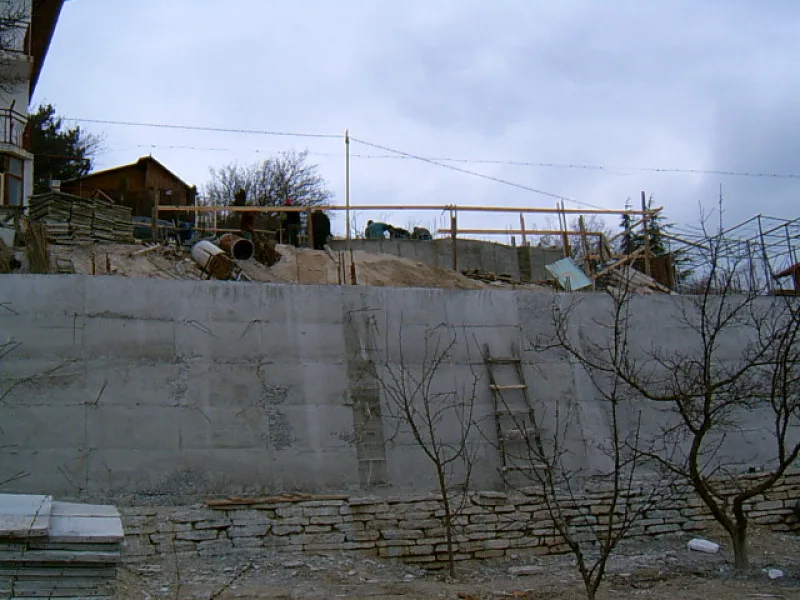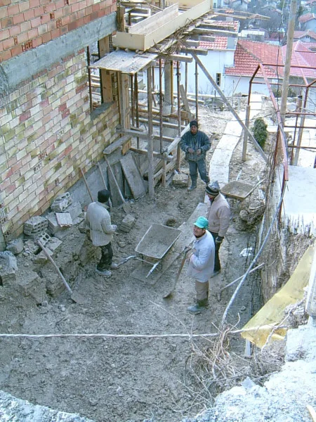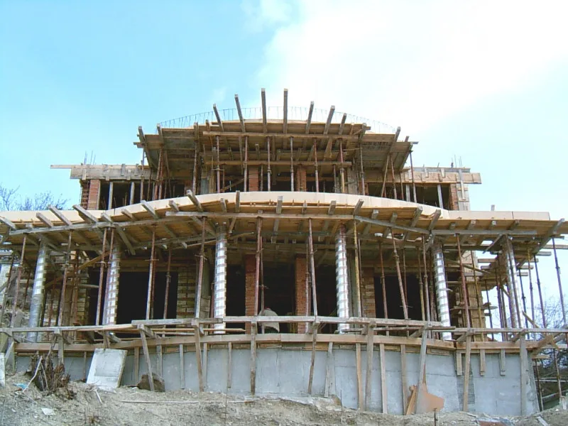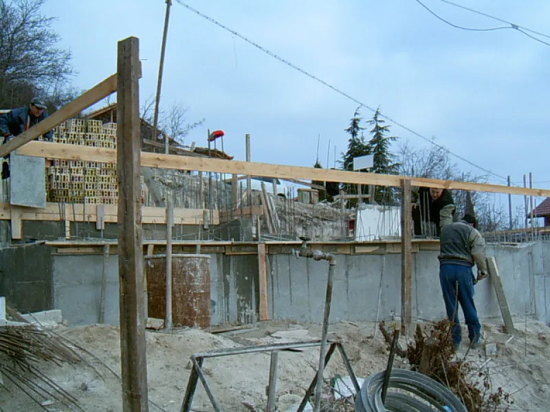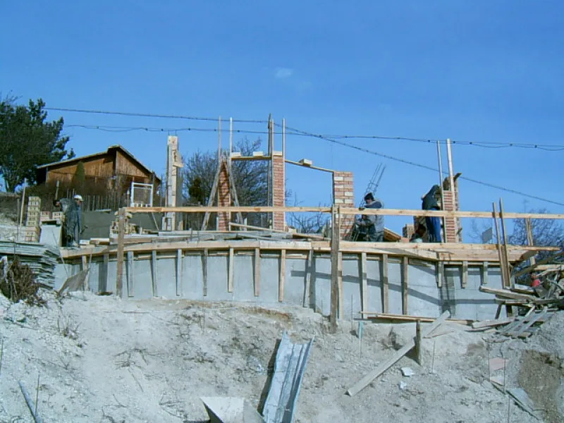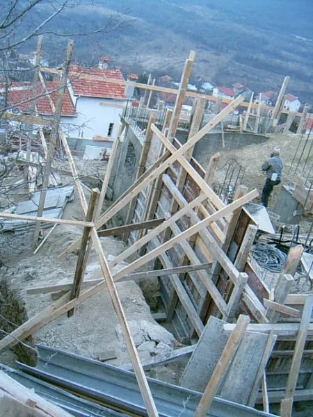 At any one time about 20 workers are on site! First job was to build a reinforced concrete retaining wall at bottom of site to stop earth movements. Then, foundations to no less than 15m below road level were dug out, plus trenches for 2m high walls to sides of site - mostly by hand. After this, a colossal amount of concrete was used to construct the basement. Complex shuttering was needed to create a semi circular balcony which will have stunning views towards Albena bay.