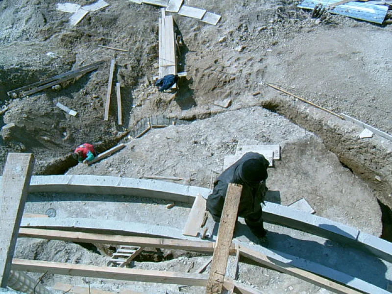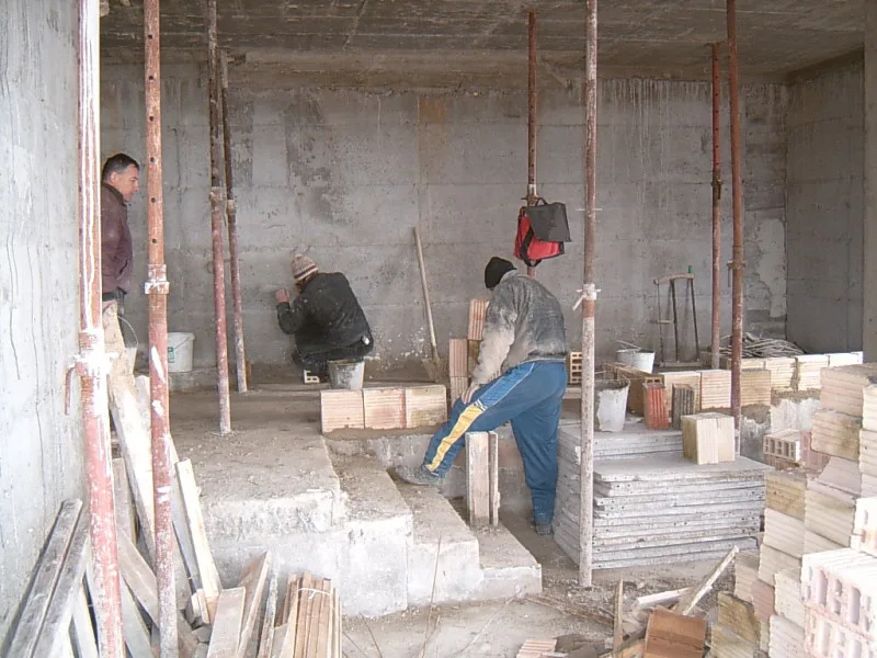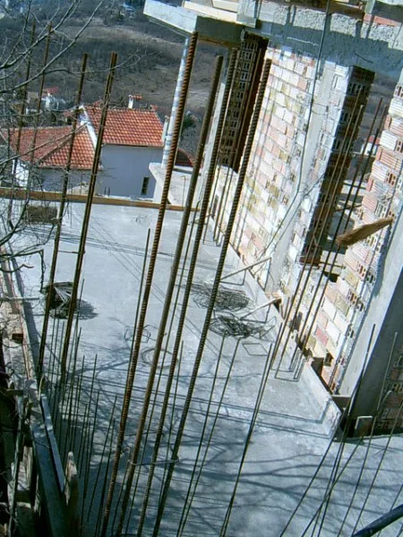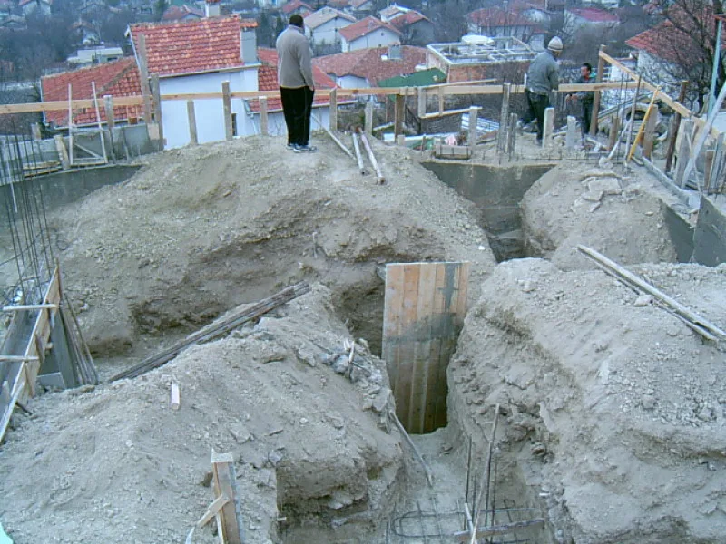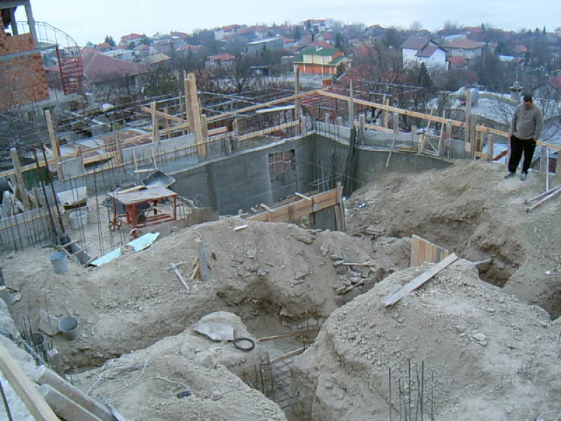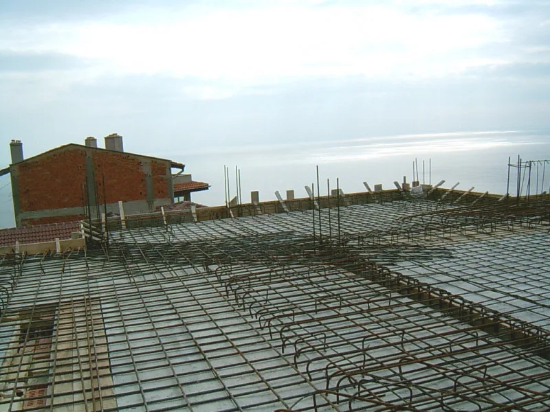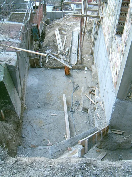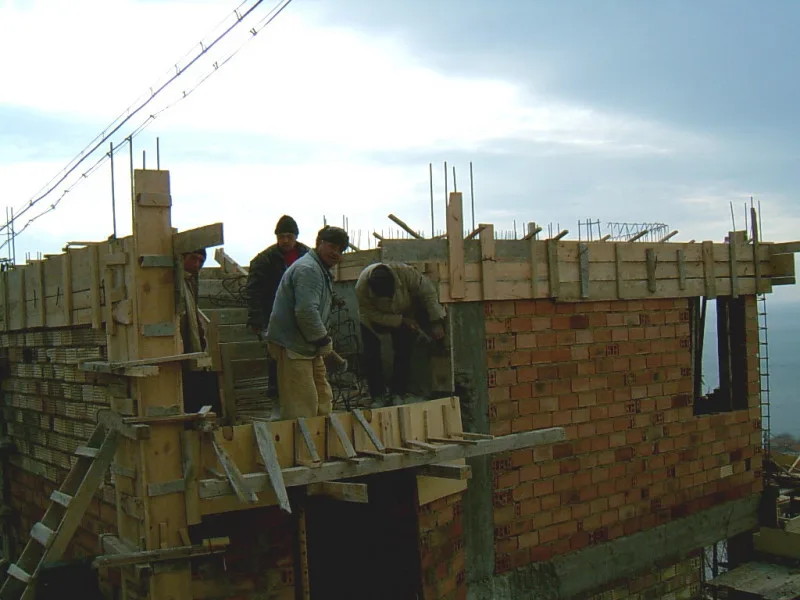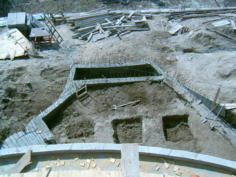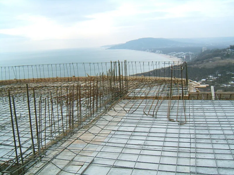 At any one time about 20 workers are on site! First job was to build a reinforced concrete retaining wall at bottom of site to stop earth movements. Then, foundations to no less than 15m below road level were dug out, plus trenches for 2m high walls to sides of site - mostly by hand. After this, a colossal amount of concrete was used to construct the basement. Complex shuttering was needed to create a semi circular balcony which will have stunning views towards Albena bay.
