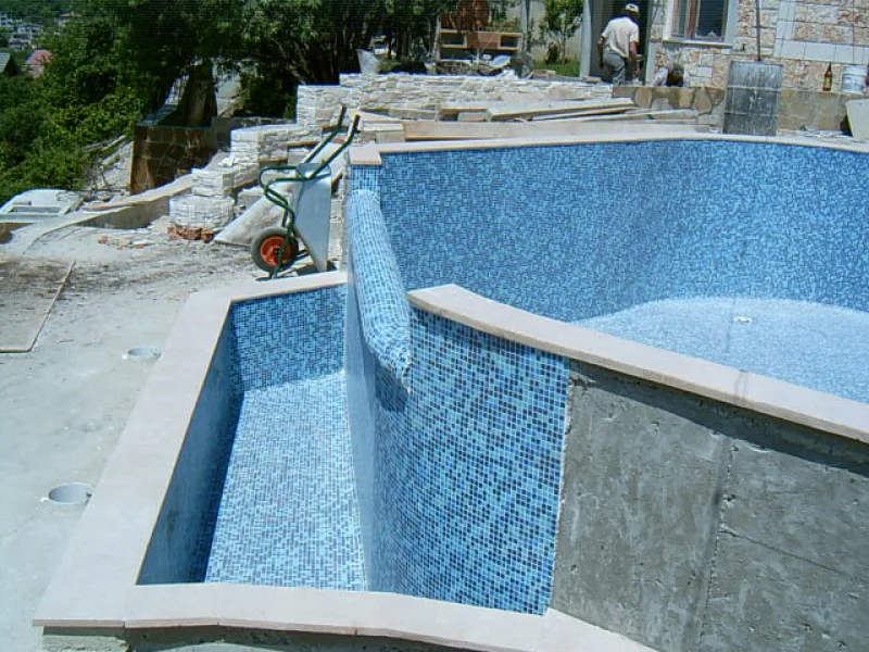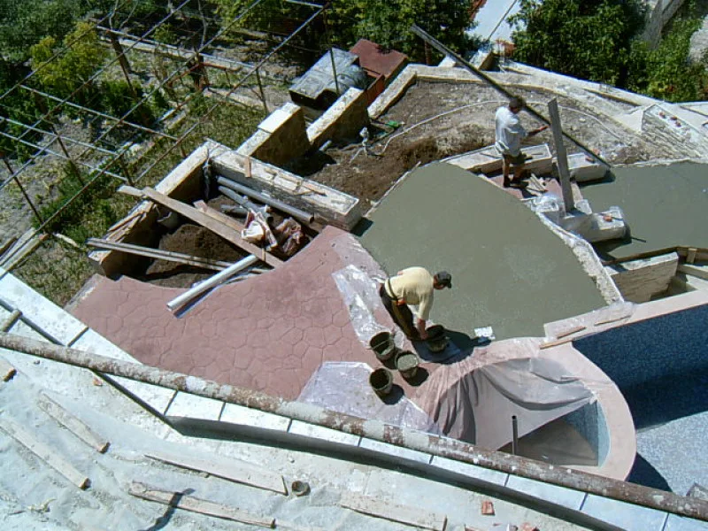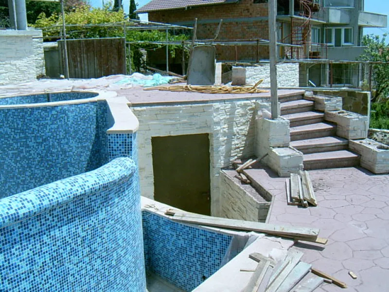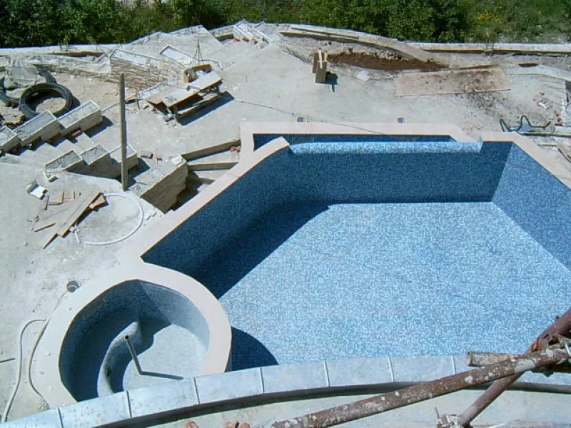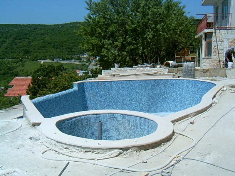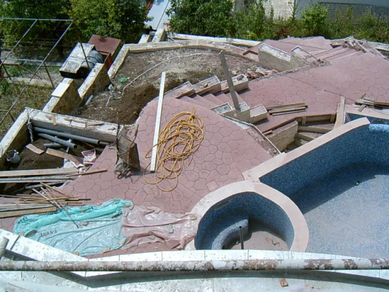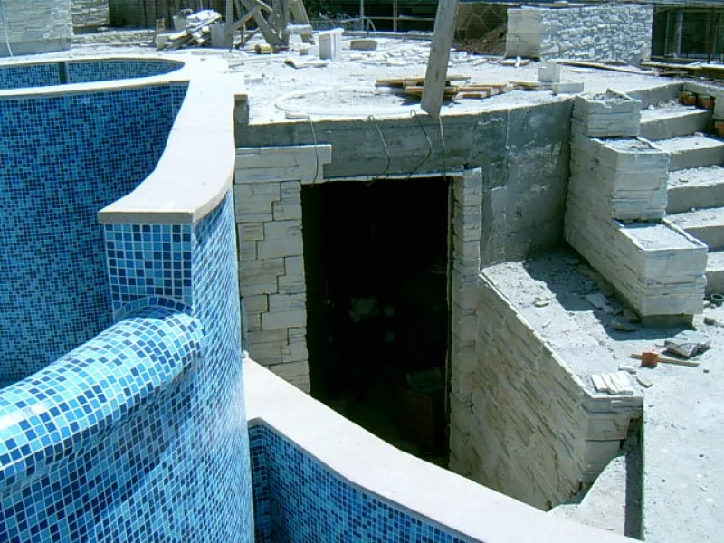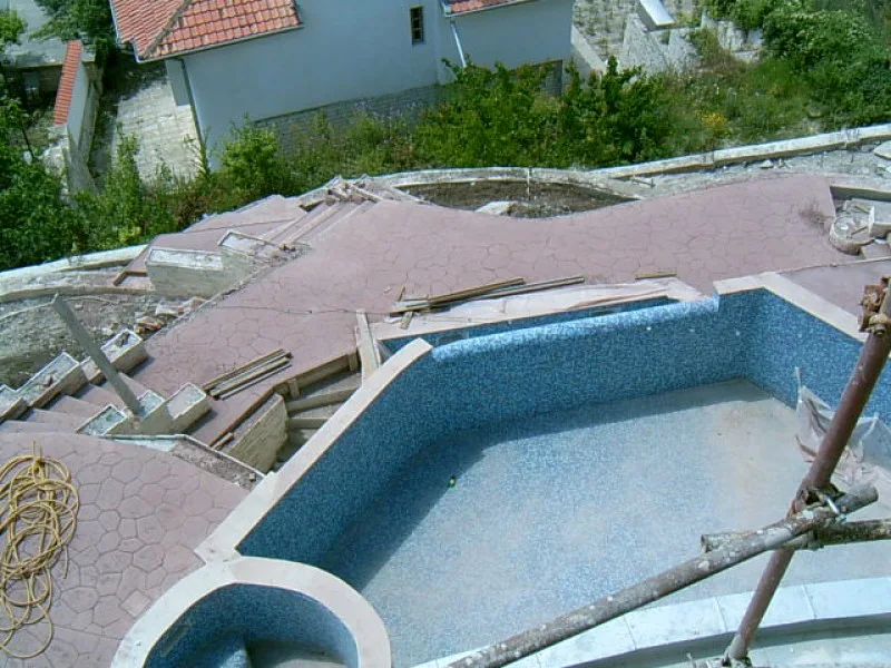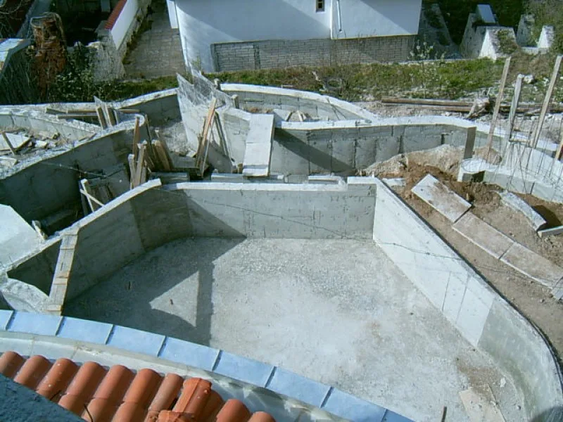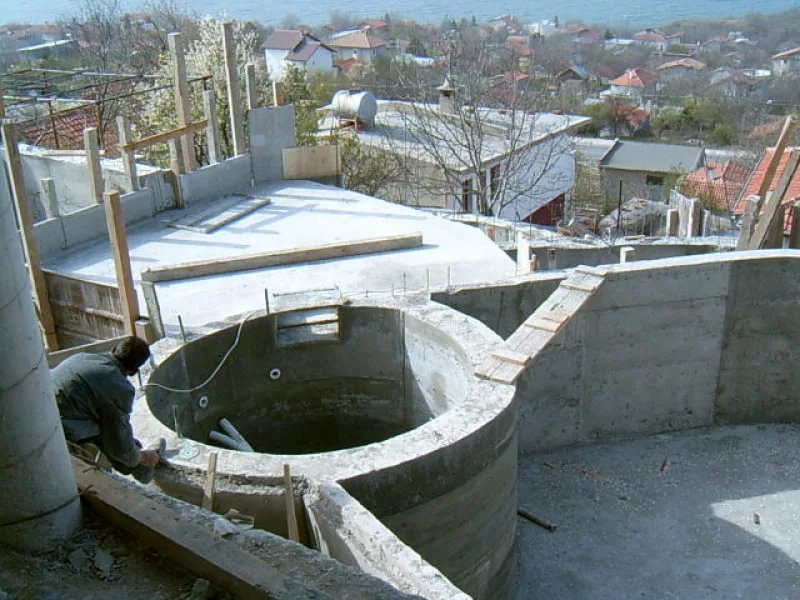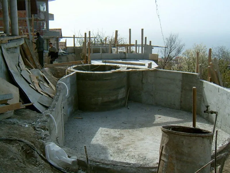 As this villa is “cutting Edge”, the architect and builders have had to learn new concepts as well as deal with a very difficult steep site. When you consider that even swimming pools are unusual for Bulgarian villas, an integral Jacuzzi is certainly a new idea. The one fitted here is custom made in concrete with fitted pump and outlets, rather than an off the shelf plastic inset. It will be deeper and more robust than the more unusual factory made drop in variety.