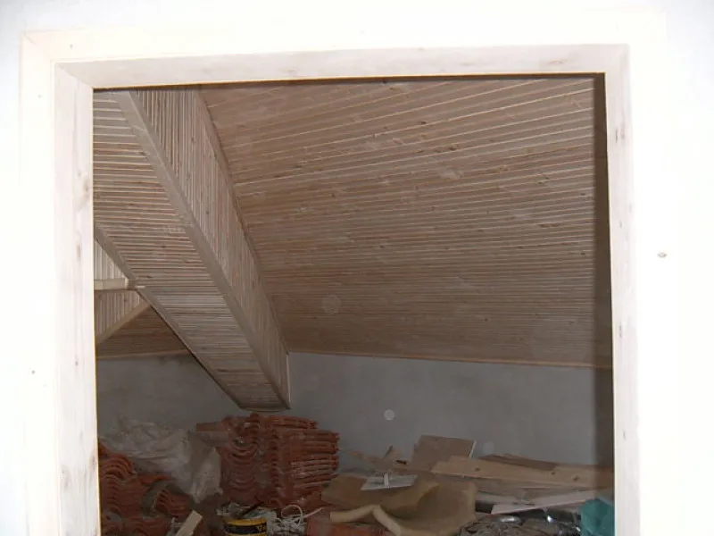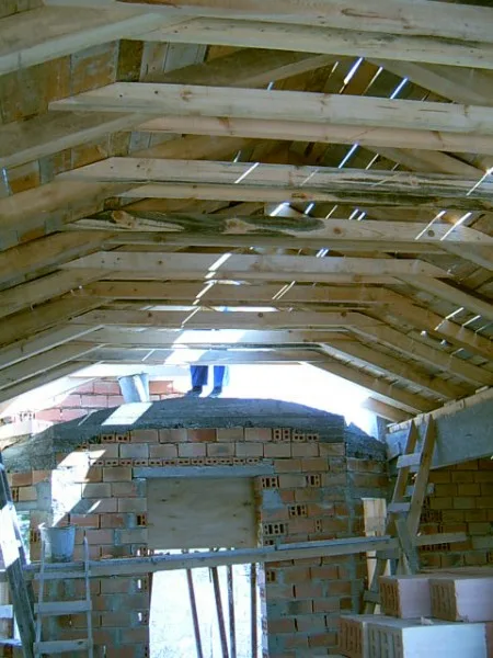 The building works of the heavy reinforced concrete lintels to support the roof continues. And many of the props have been removed from the lower floor. After the massive concrete support lintels, the wooden rafters are fitted. The top floor is given over completely to the master bedroom, and there will be an interesting college style ceiling.
