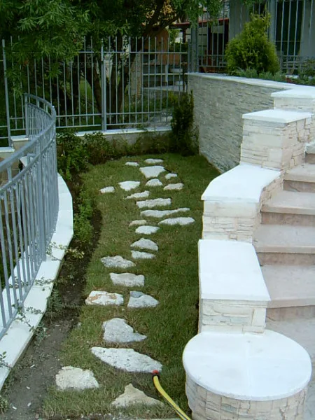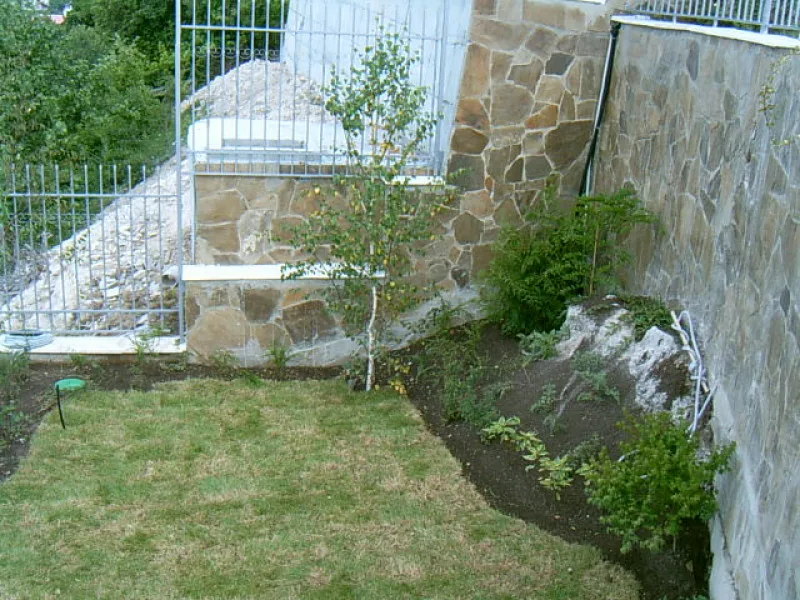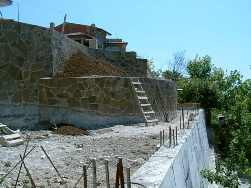 For the massive retaining wall supporting the earth by the road and for the lower site retaining walls, a natural brown stone with quartz has been chosen. A colour that matches the Black Sea coast and Albena resort area natural colours.