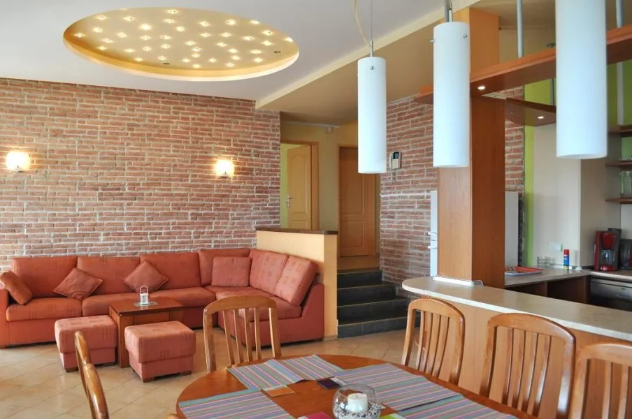Inside, decor is light sun colours, balanced together from floors to woodwork. Spacious living area with kitchen part and one great feature: the “Night Sky” constellation of lights.