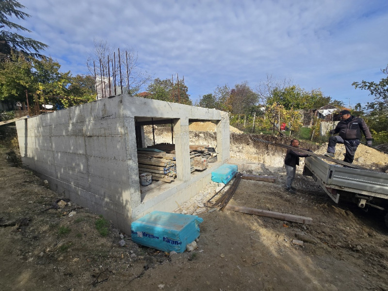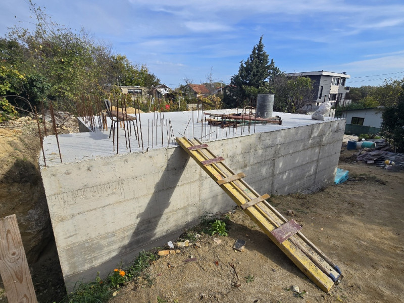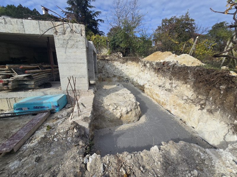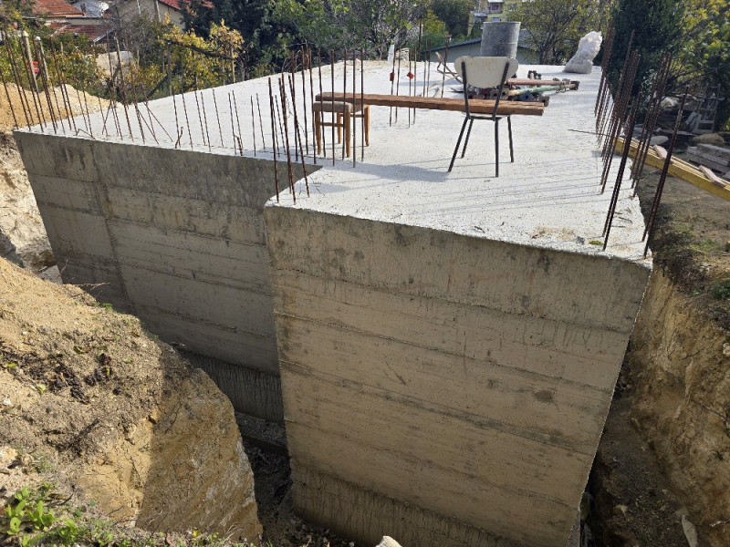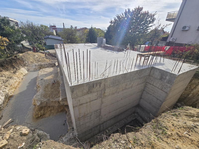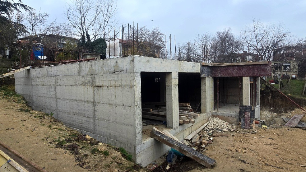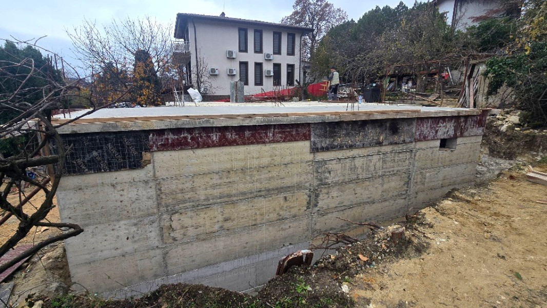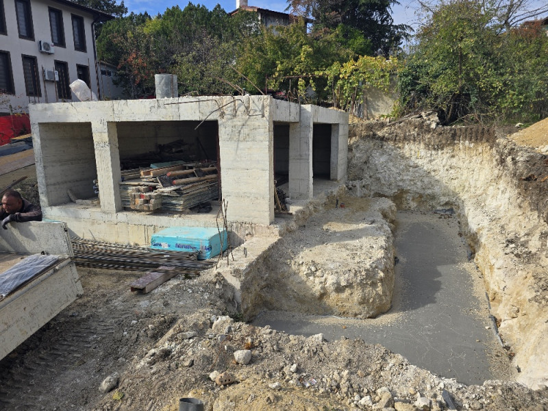 Building company Varaks continues the construction works of this house in Varna with backfill soil in foundations and compact with compaction plate. The concrete for the pavement at elevation -2.80 has been poured and reinforced concrete columns have been built. XPS thermal insulation is laid underneath. Then the shuttering has been done, the reinforcement has been fitted and the concrete for the concrete walls has been poured to elevation 0.00. Thanks to the professionalism of our team of construction workers, the construction and installation works of this project are progressing confidently. The concrete slab at elevation 0.00 has been built and the concrete for it has been poured. Due to the specifics of the project, next step is the demolition of the other old part of the old house.