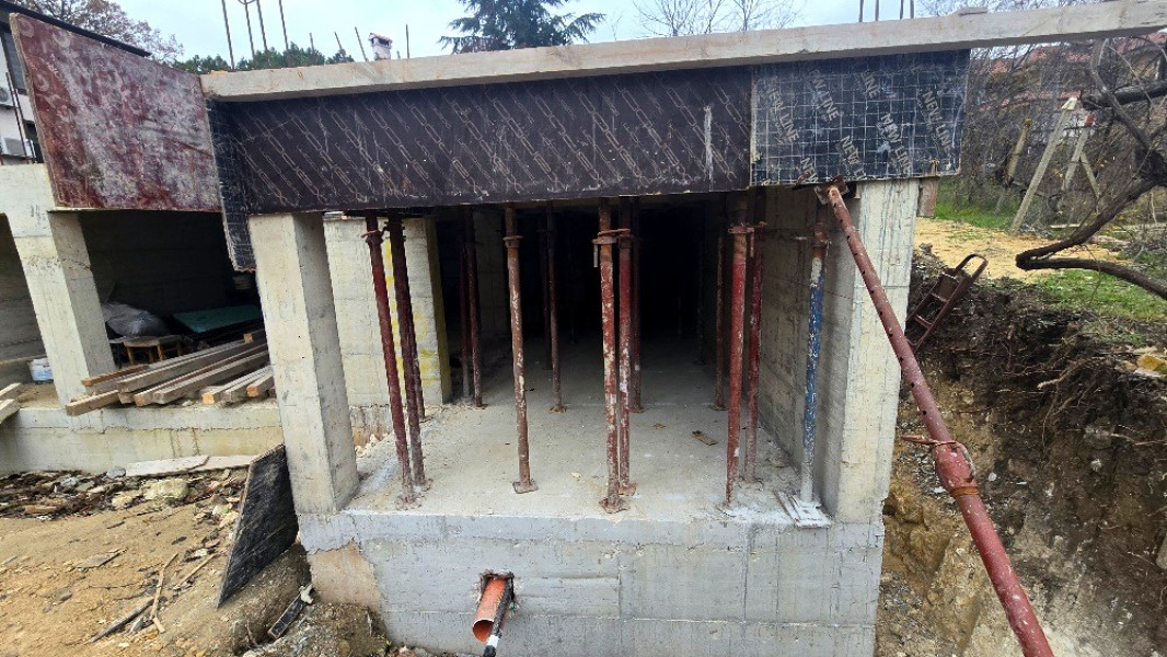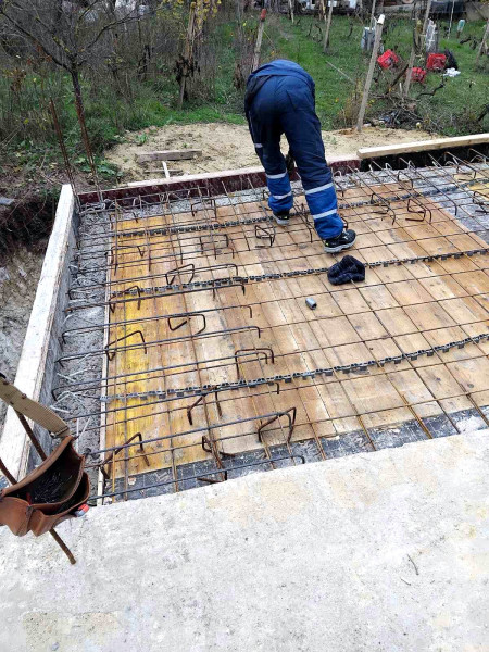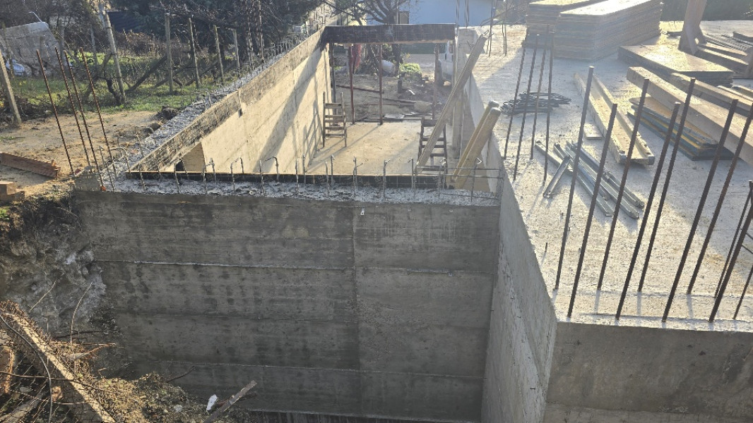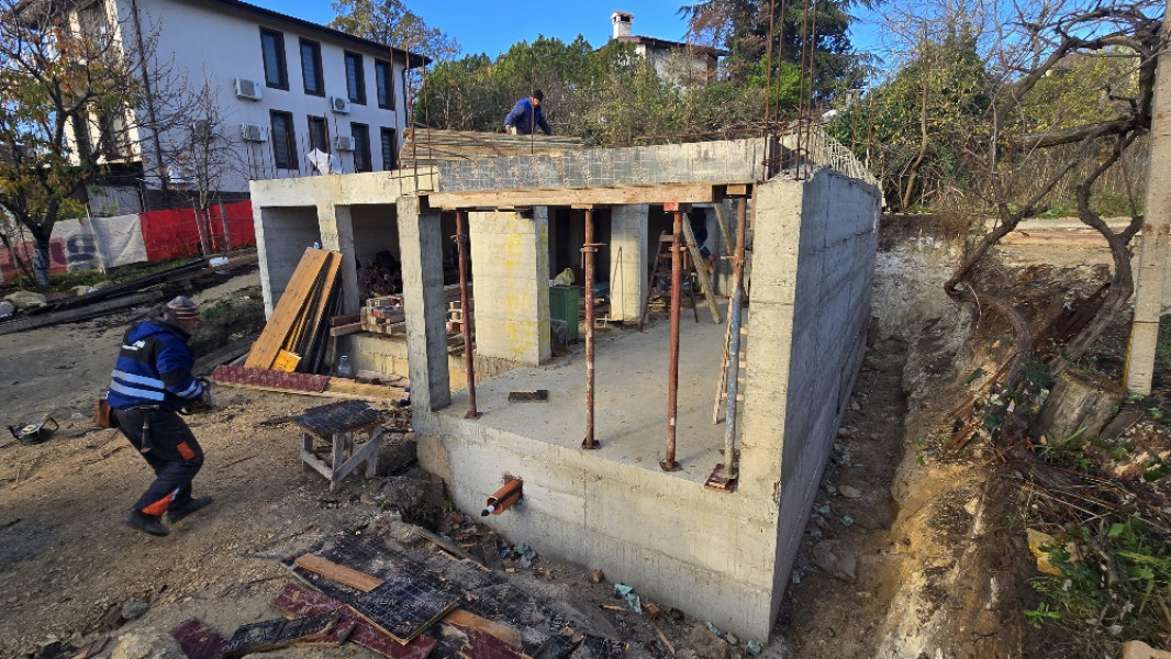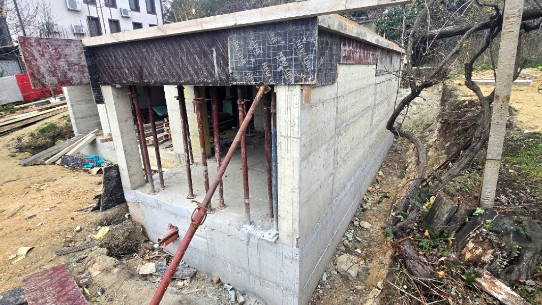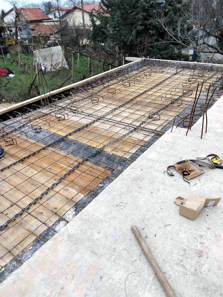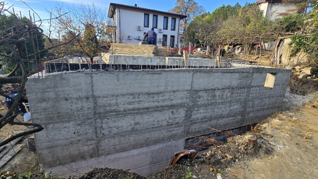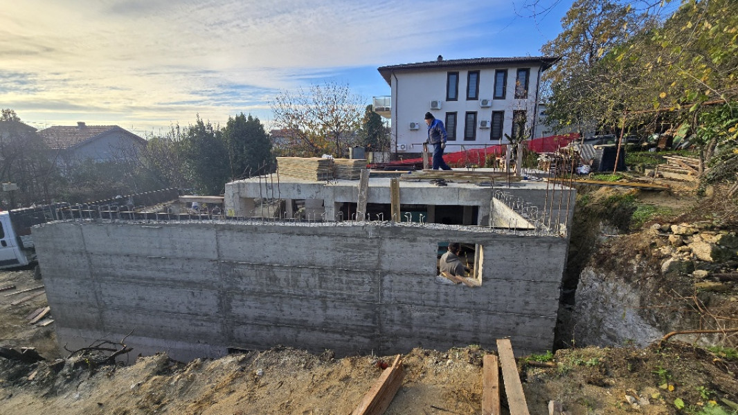 The building works of the second part of this house in Varna continue with the construction of reinforced concrete walls up to elevation 0. After their construction, the building workers make shuttering and reinforcement for the slab at elevation ±0.00. This is followed by pouring of concrete, which completes the structural slab and prepares it for the next stages of construction.