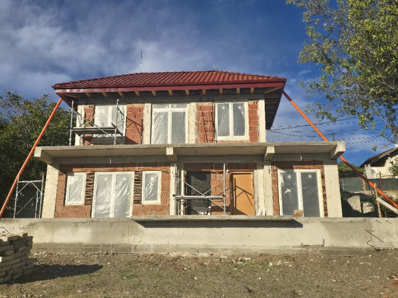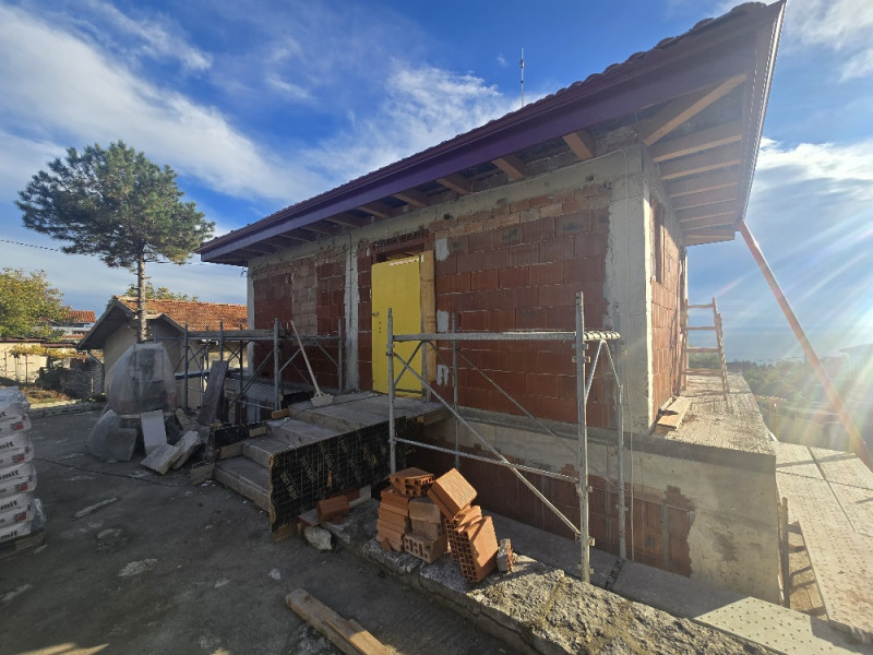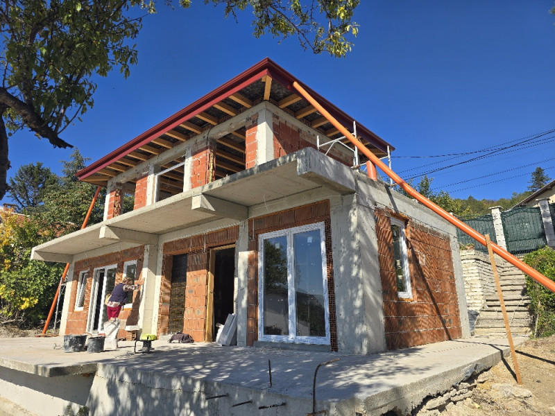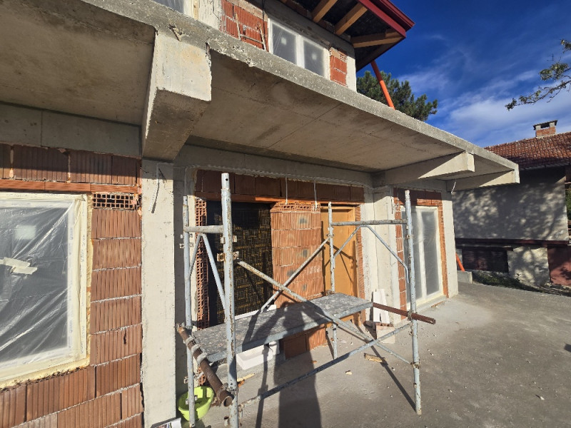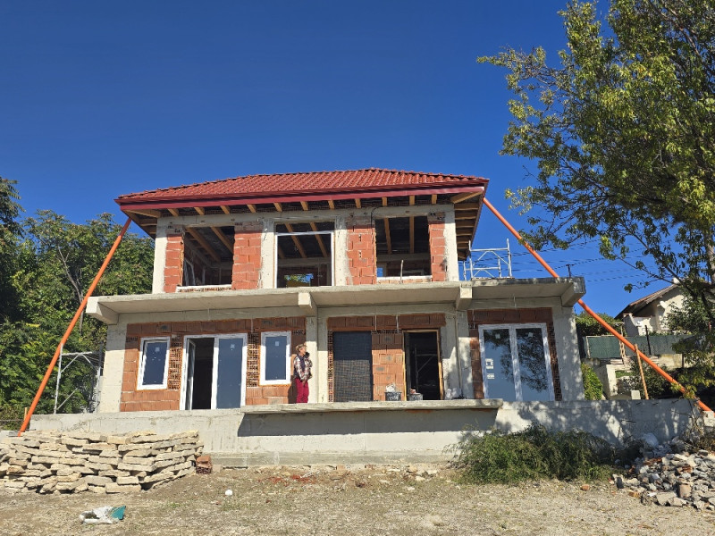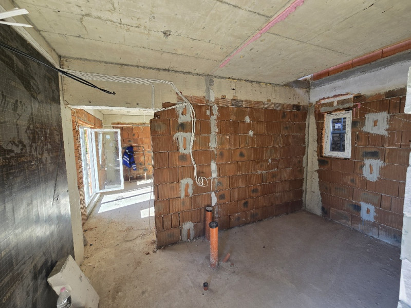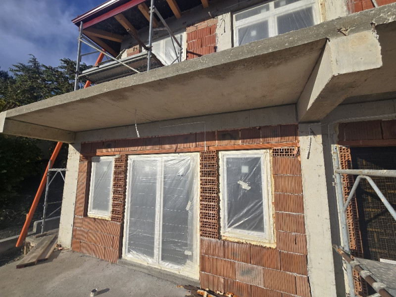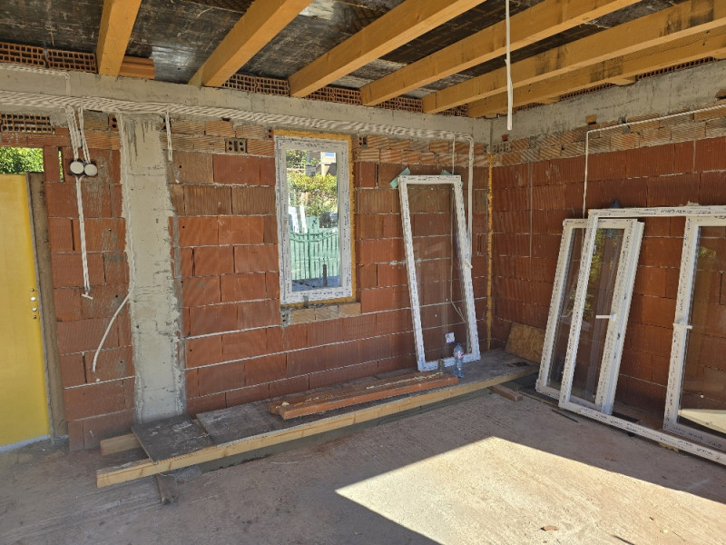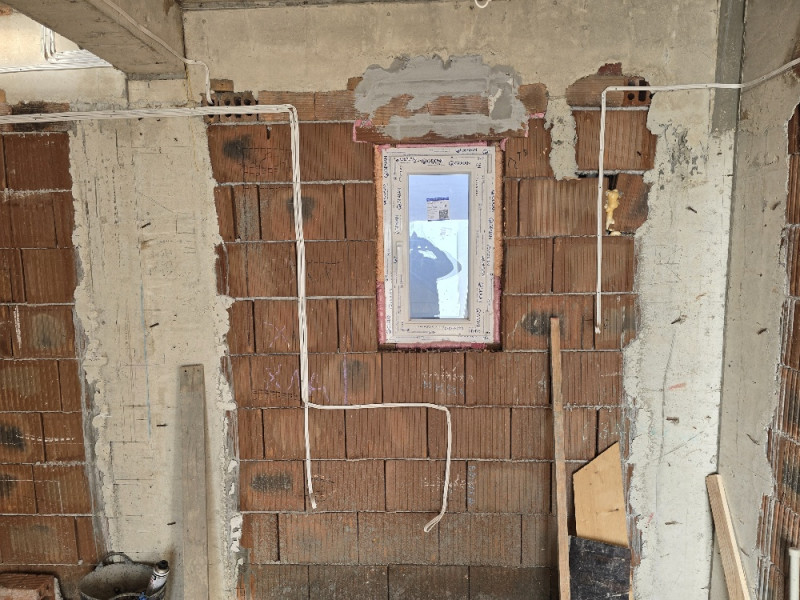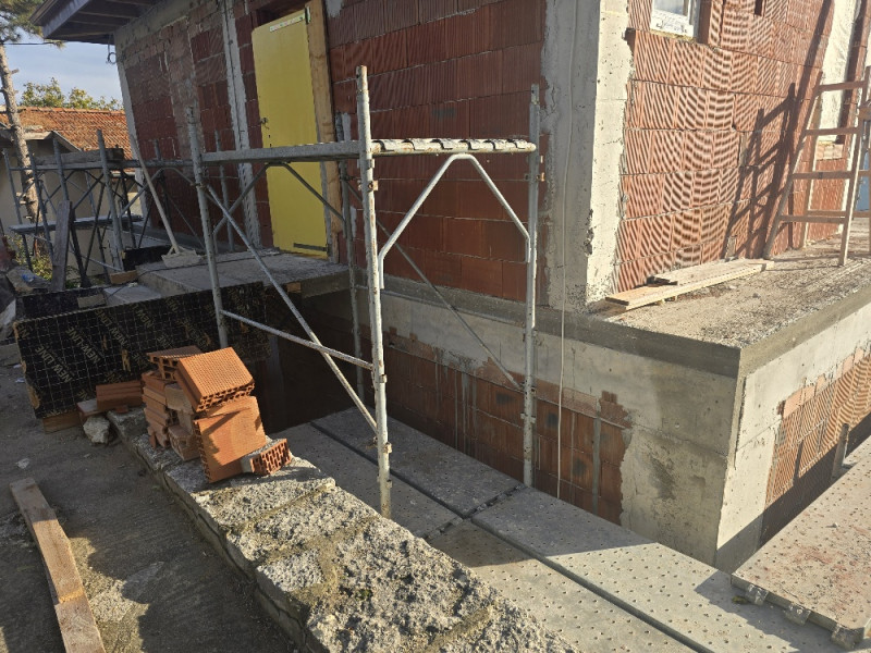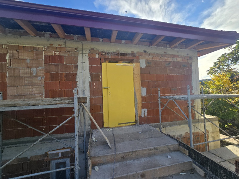 At this stage of the construction of the house the YTONG doorsteps under the UPVC doors have been removed and new ones have been made of reinforced concrete. A concrete platform and steps to the entrance door have been poured and reinforcement has been made with support beams at high altitude. The masons started shaping the walls of the bathroom. In parallel, the UPVC windows and doors were covered with dust sheets and scaffolding has been built for the upcoming works on the facade.