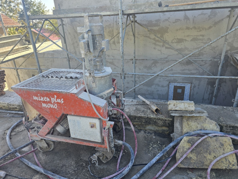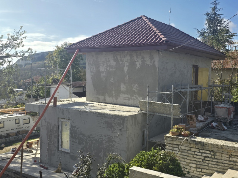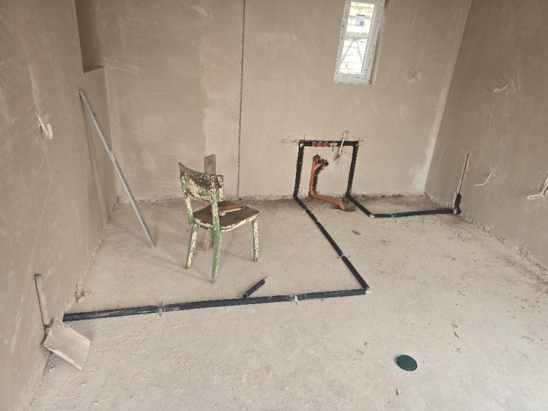 The construction works of this house in Balchik continues with precise plastering of the interior walls and ceilings. The new bathroom is fully built and plastered. Our construction specialists prepared the facade walls with contact primer and applied external plaster with these activities being done at a high height in compliance with all the safety standards. After the render has been applied, the team of construction company Varaks begins the installation of the plumbing system in the house.