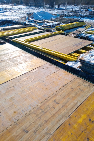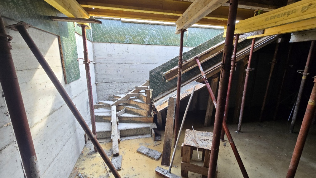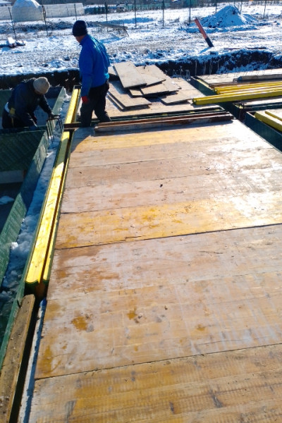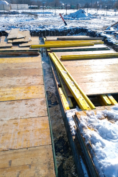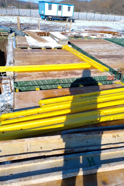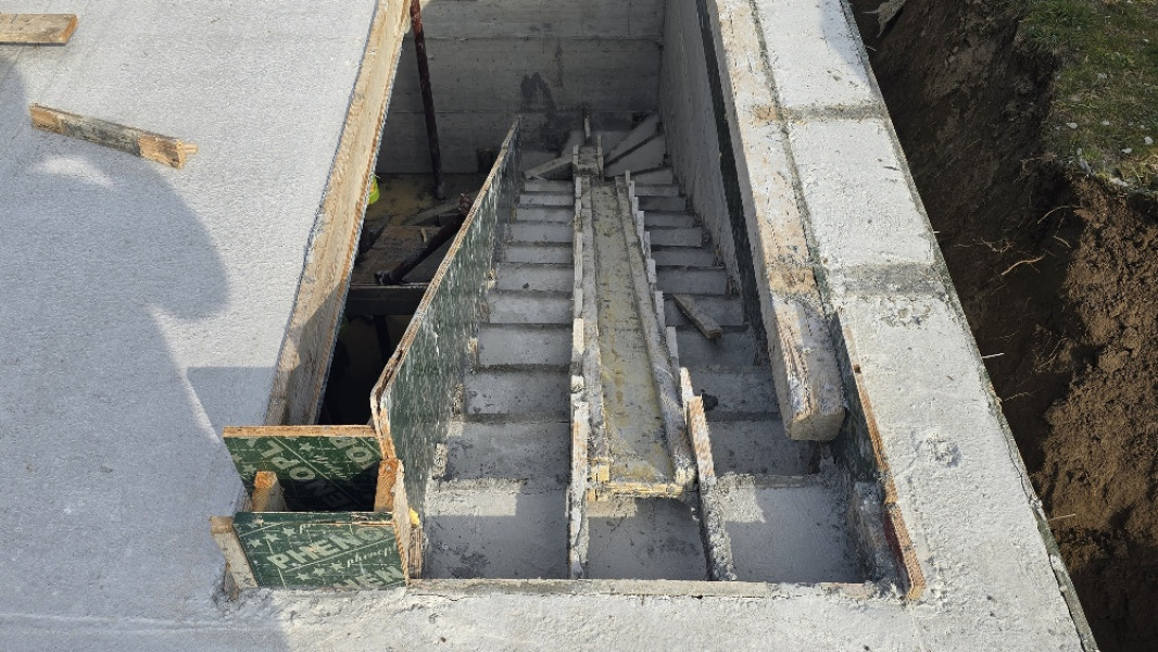The building works of the rough construction of a single-family house in Varna continues on schedule. At this stage, the team of construction company Varaks is making shuttering for the slab at elevation ±0.00. High-quality three-ply formwork panels are being fitted, as well as formwork beams to support and strengthen the panels. The shuttering for the staircase is also being made. The construction workers are installing hydrophobic plywood, which is particularly suitable for operation during the winter months, due to its water resistance and ability to be used in a humid environment.