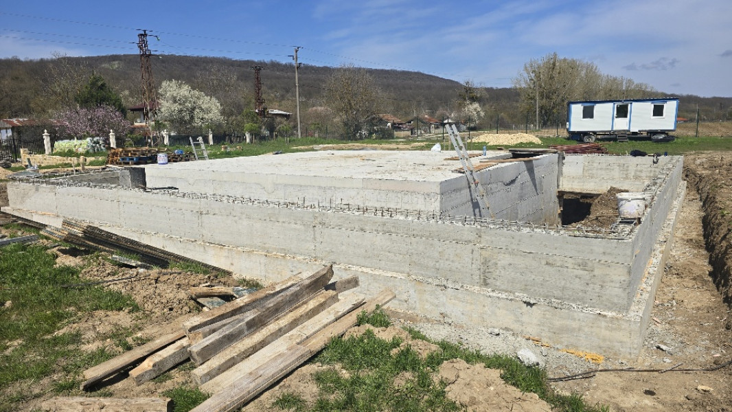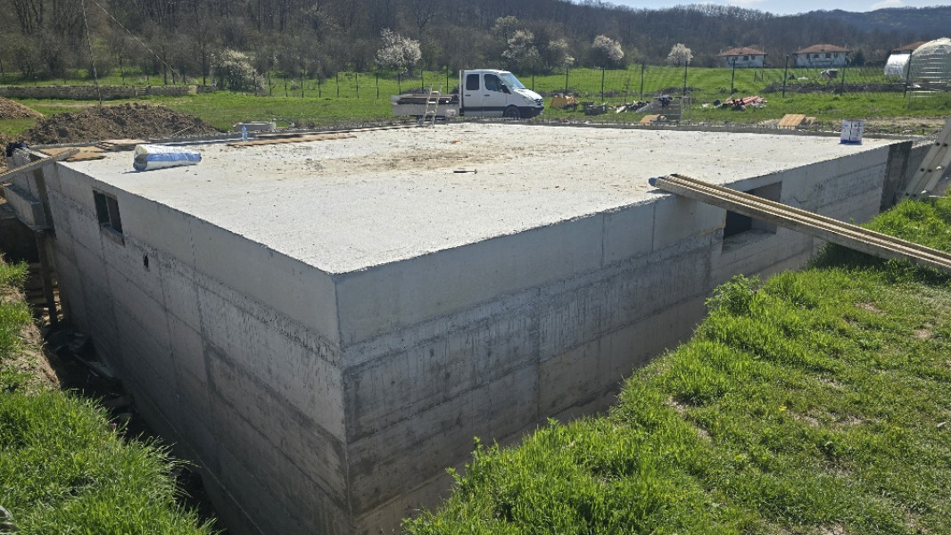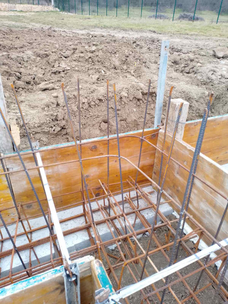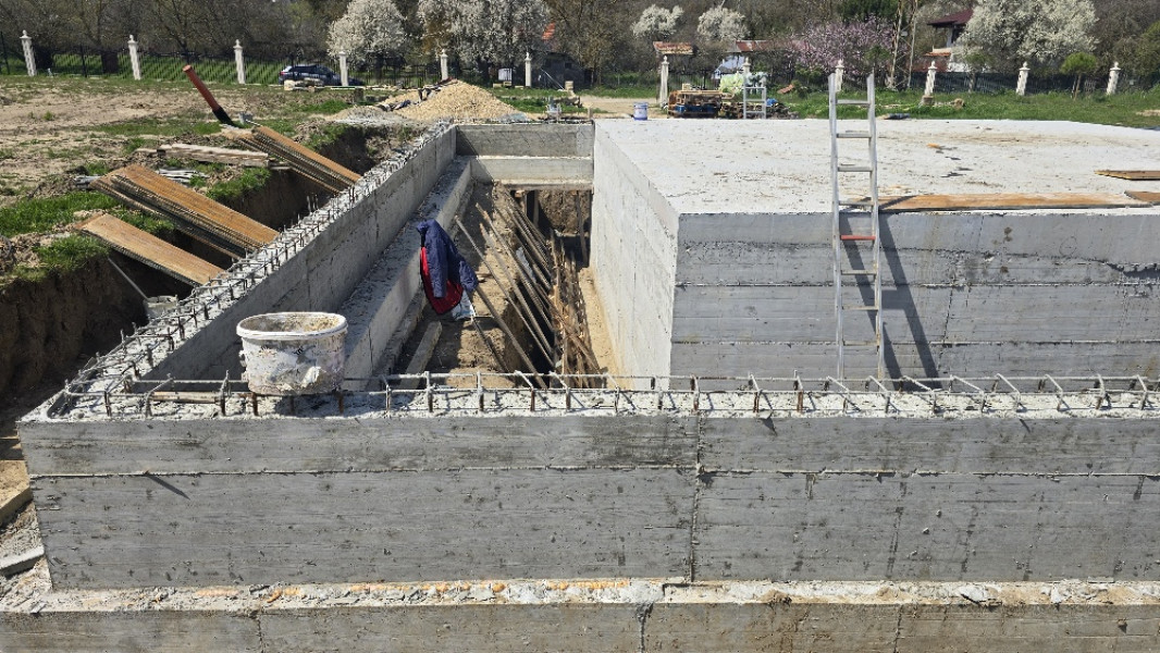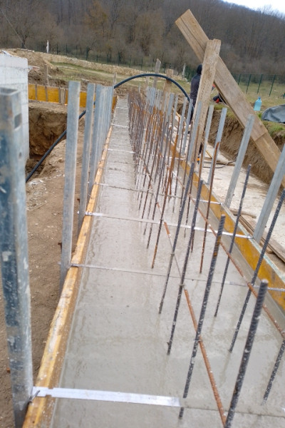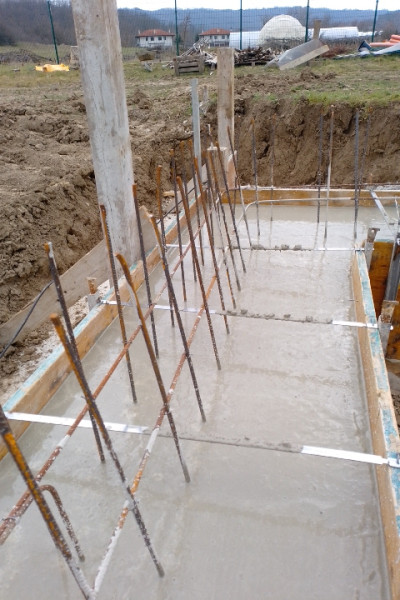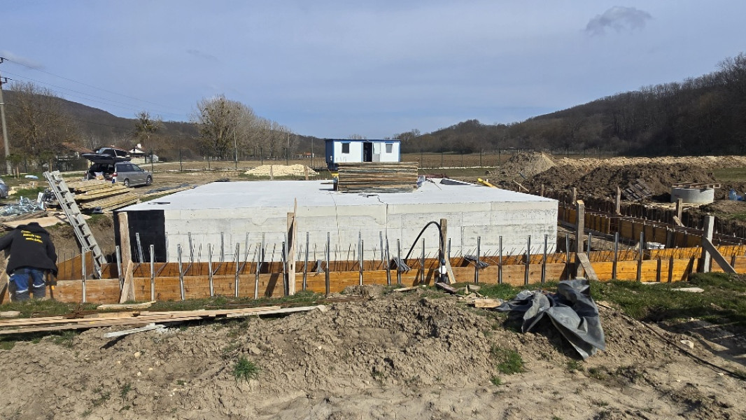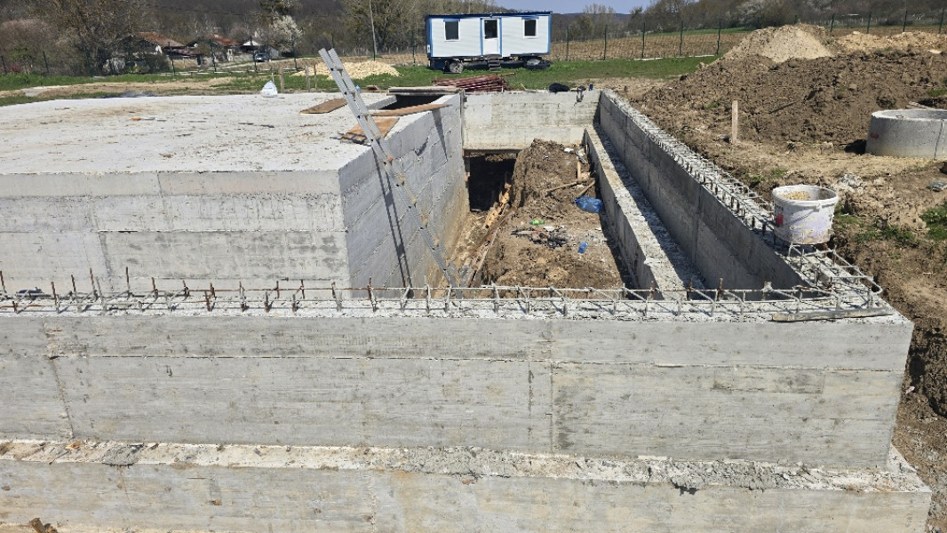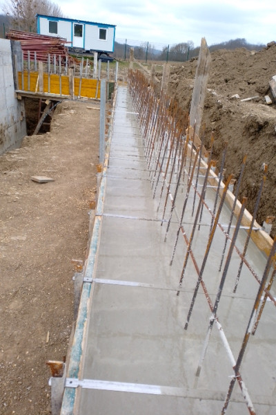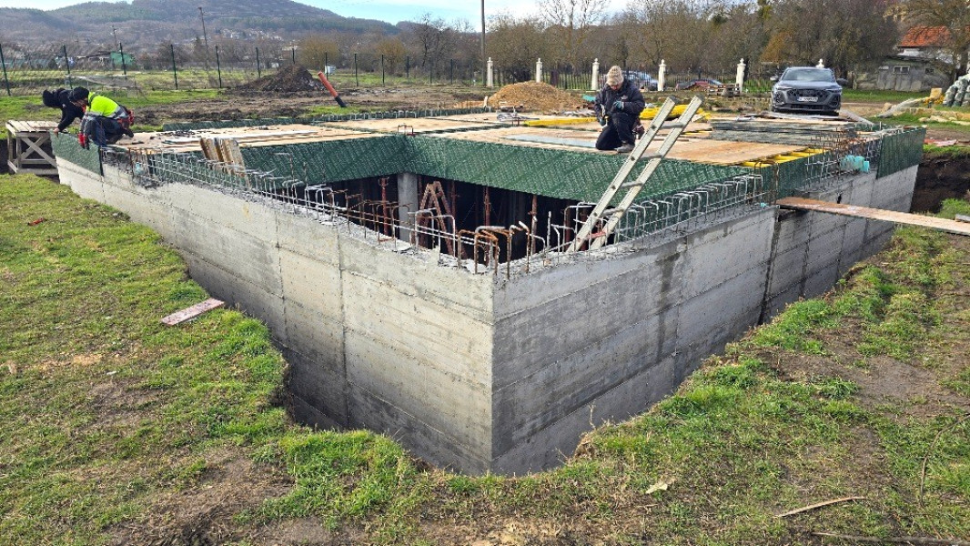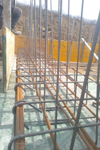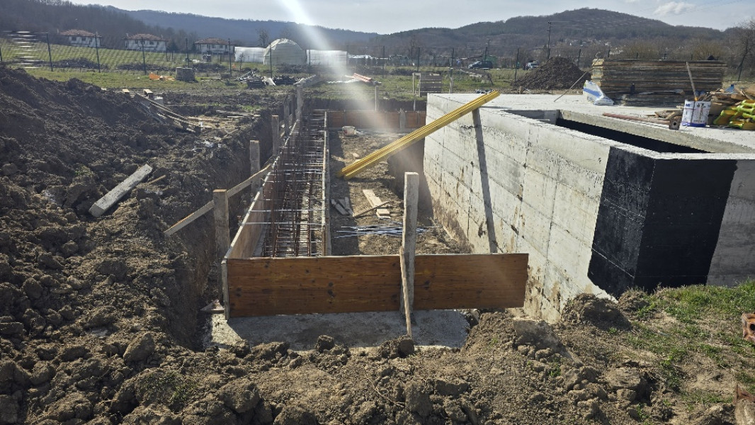 Construction company Varaks continues the building works on this house in Dolishte with the fitting of wall reinforcement up to elevation +0.00. The shuttering has also been made, after which the structural concrete is poured, which is compacted and left to cure. In the places provided in the project, the construction workers fit reinforced concrete columns.