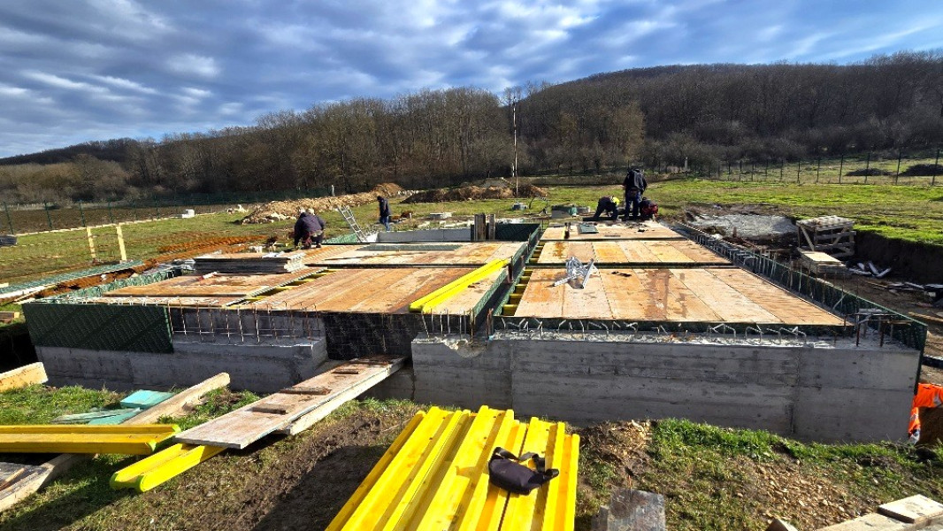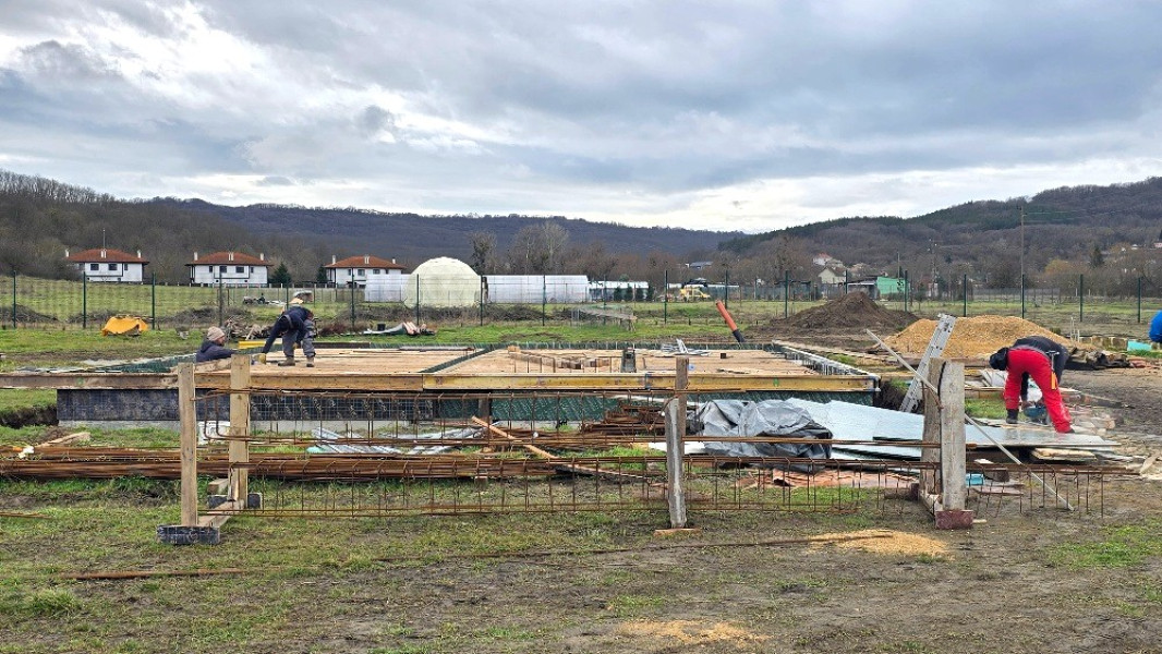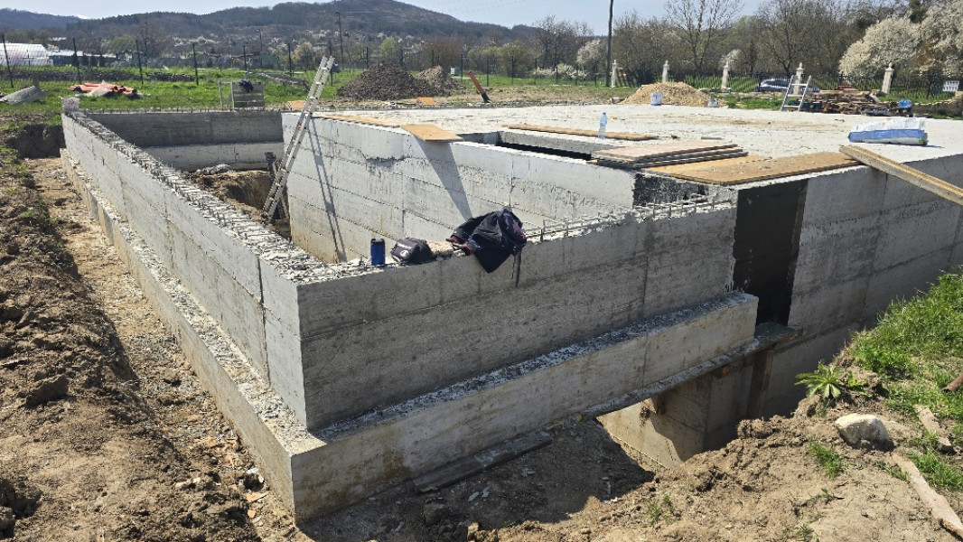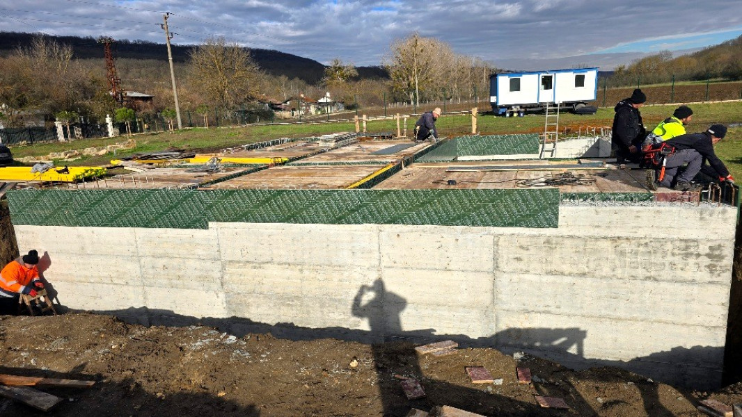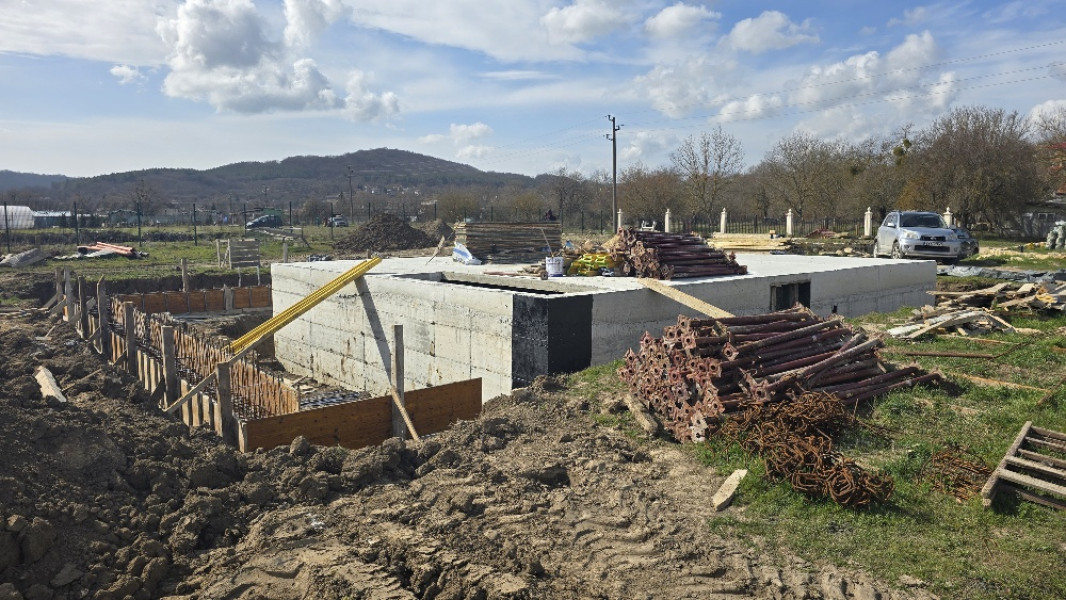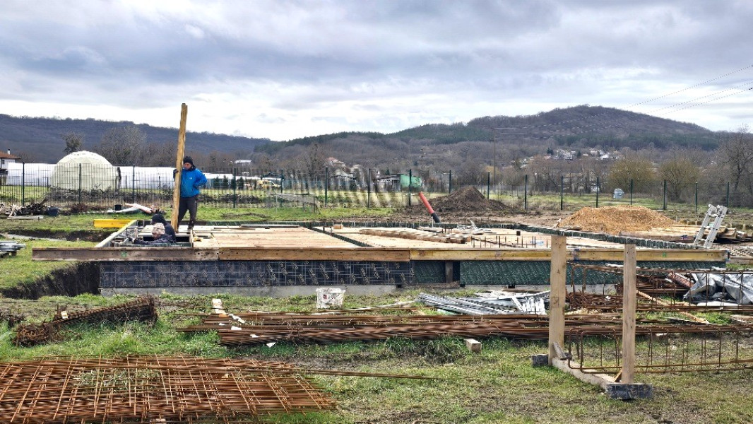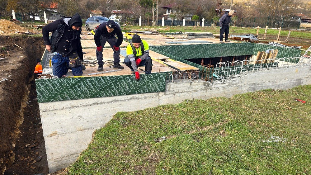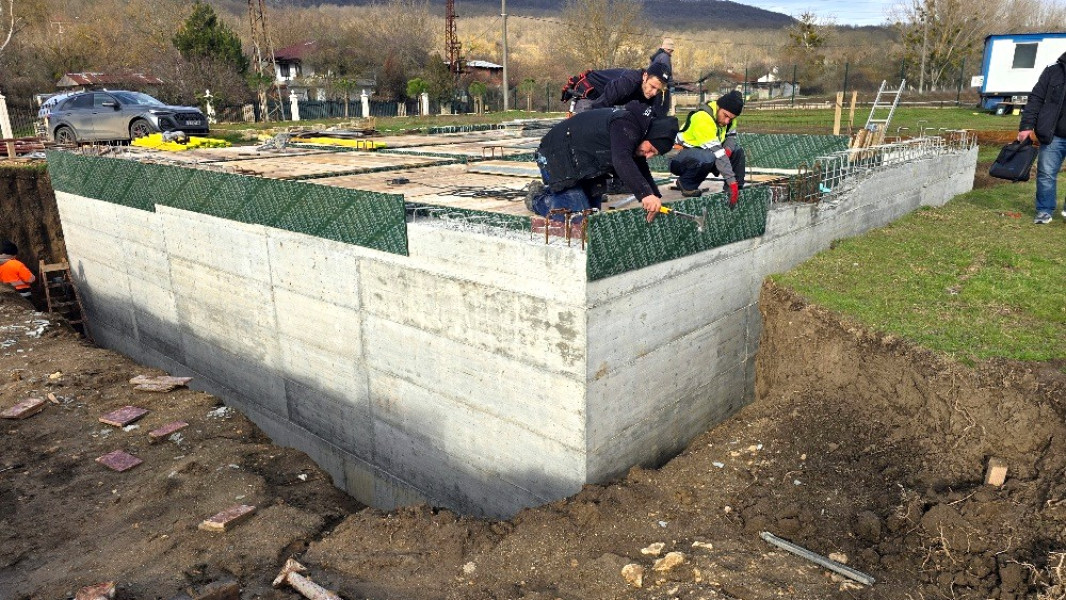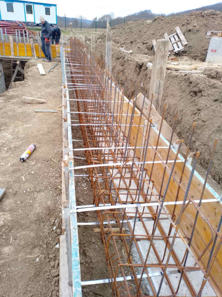 Construction company Varaks continues the building works on this house in Dolishte with the fitting of wall reinforcement up to elevation +0.00. The shuttering has also been made, after which the structural concrete is poured, which is compacted and left to cure. In the places provided in the project, the construction workers fit reinforced concrete columns.