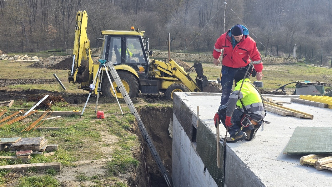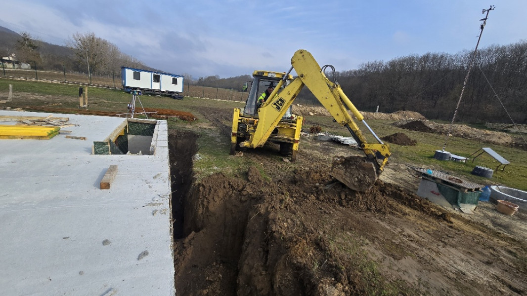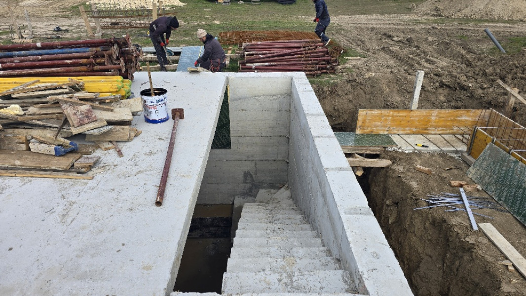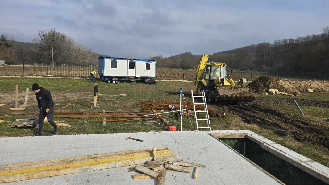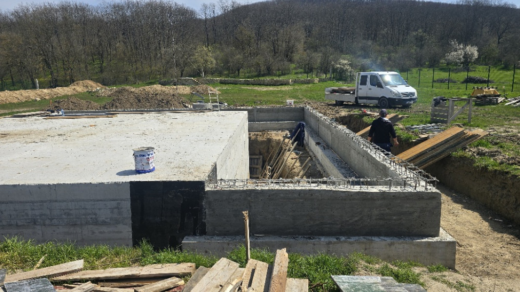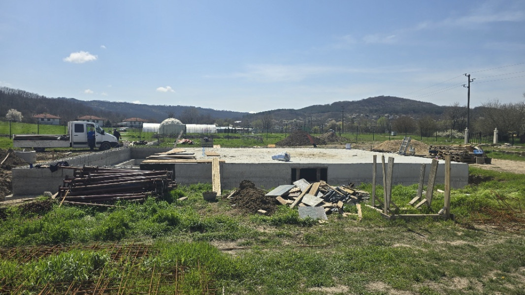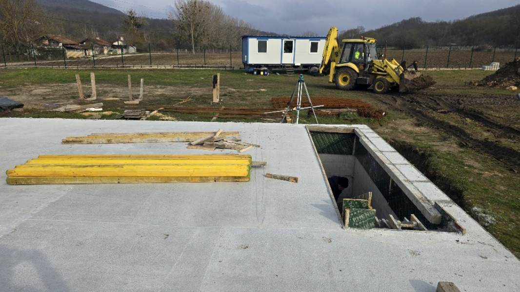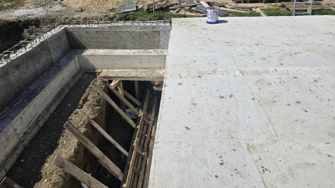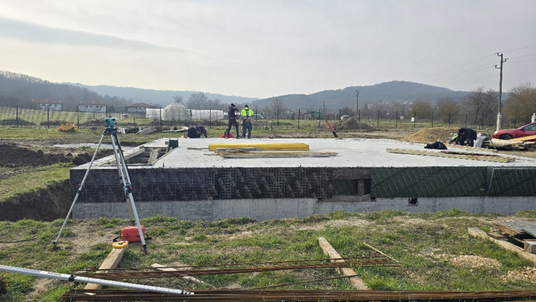 The construction of the house in Varna continues. At this stage, the team of construction workers ties the reinforcement for the slab at elevation 0.00. This is followed by laying concrete for the slab, which is poured and carefully smoothed. Construction company Varaks also takes care of building a home for the family's faithful friends - the dogs. A patio is being made for their house. Construction works on it begins with fitting polyethylene, reinforcing bars are placed on it, after which the concrete for the foundation is poured.