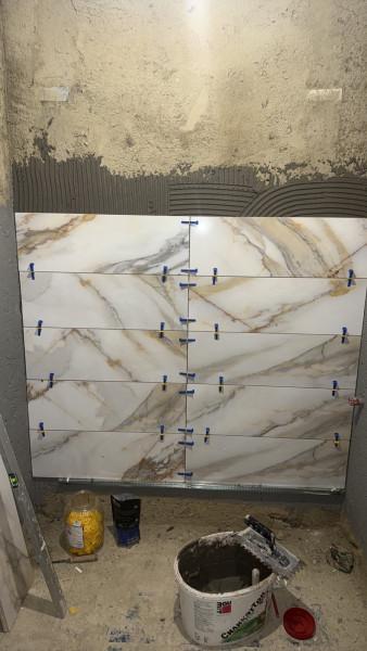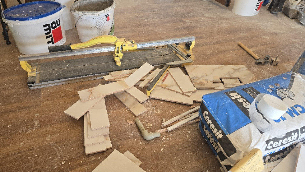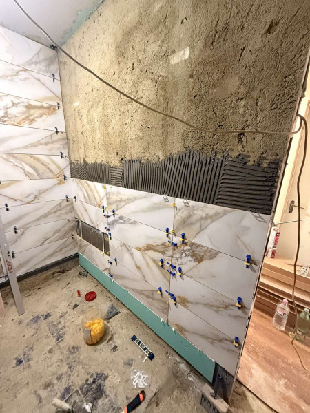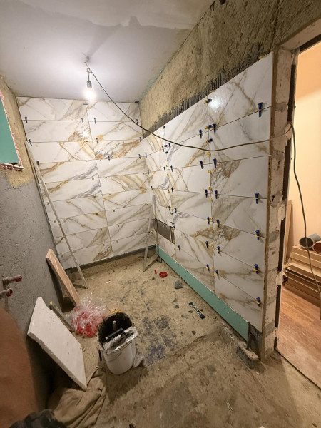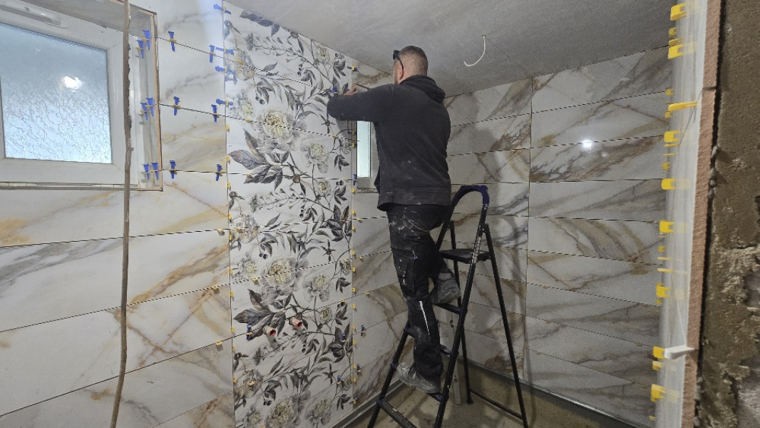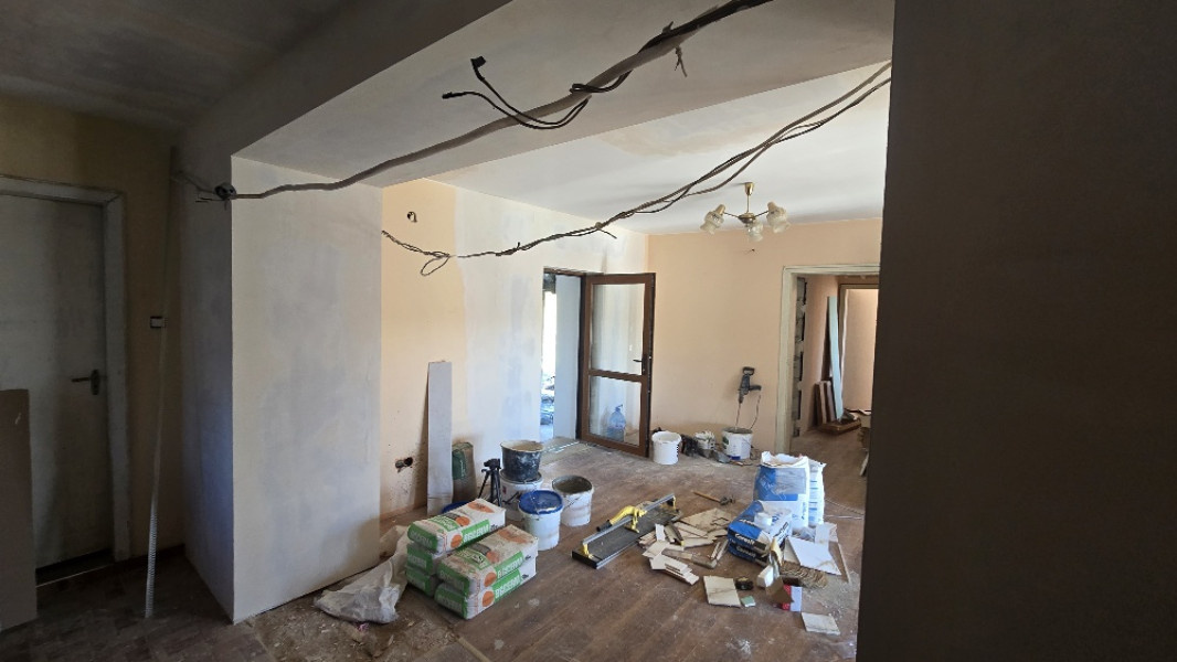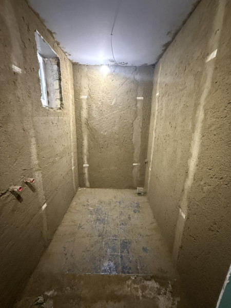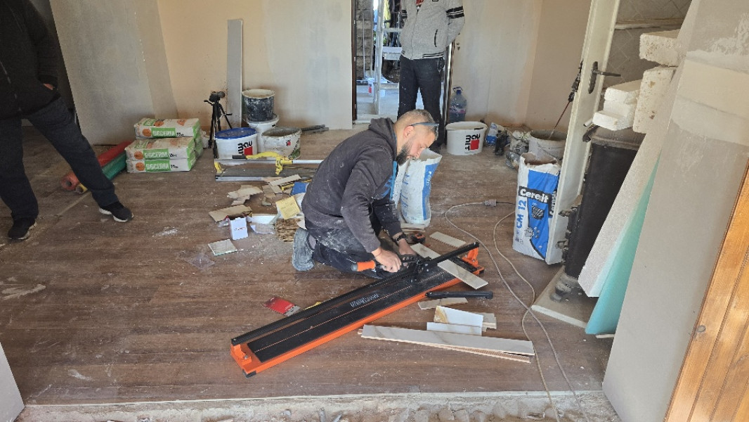 The construction and renovation works of this house in Kavarna continue with internal finishing works in the bathroom. A new plumbing and electrical installation has been made. Plaster has been applied to the walls, as well as waterproofing and waterproofing tape has been laid on walls and floor. The works on fitting the tiles have also begun.