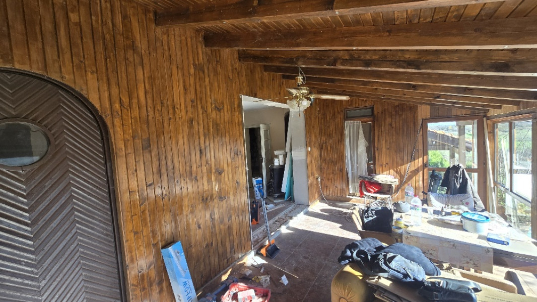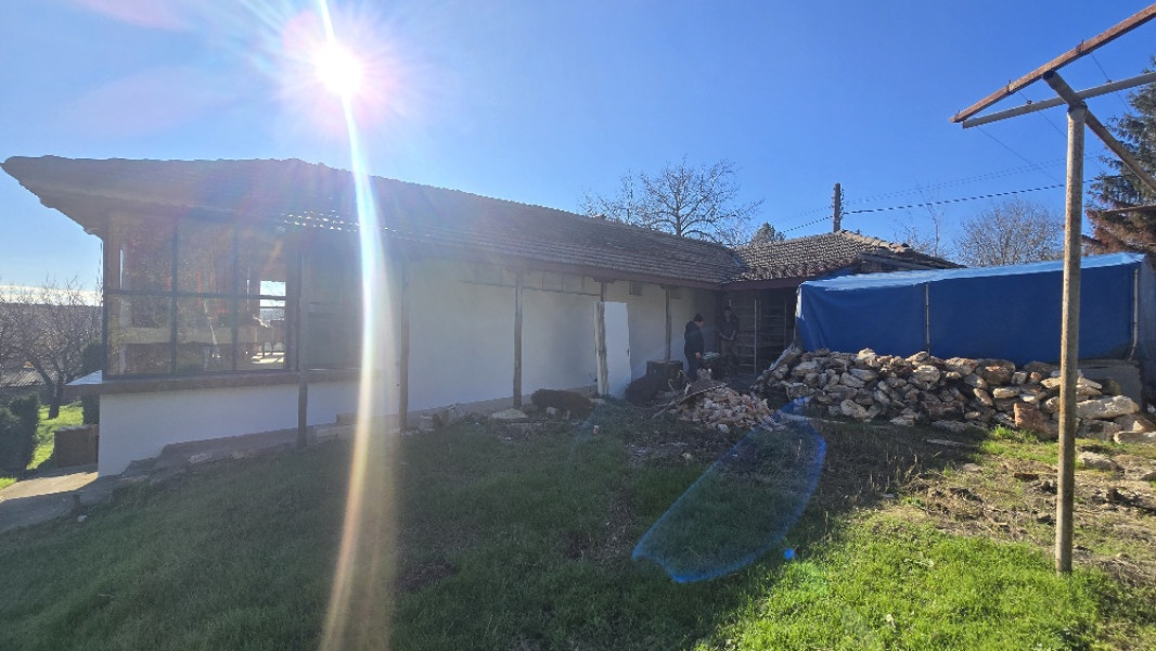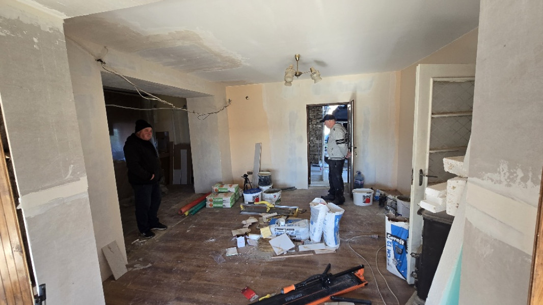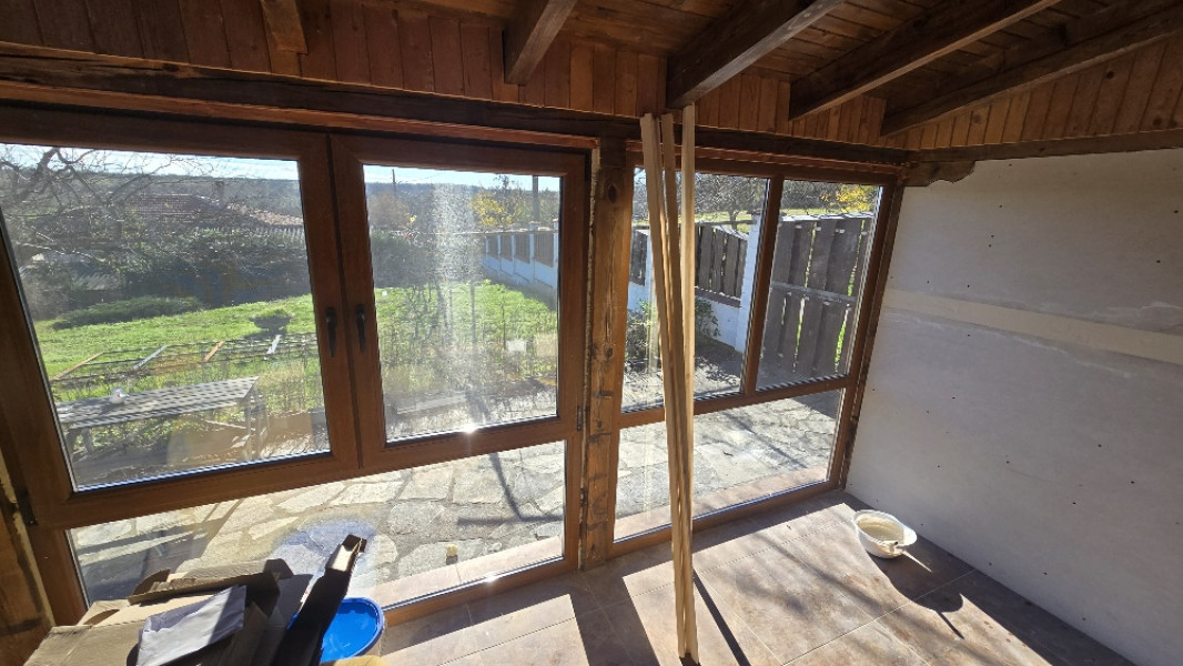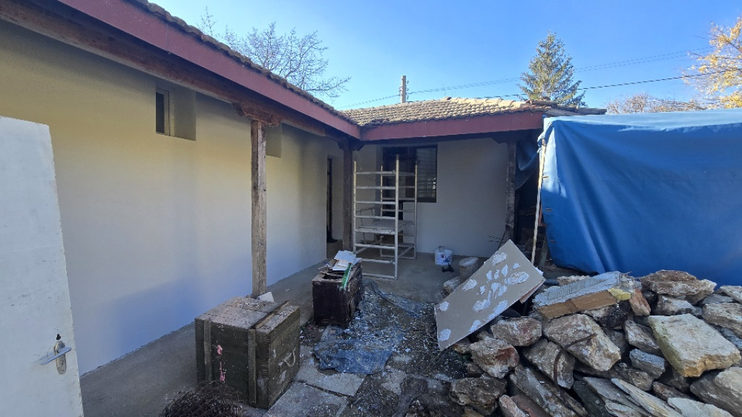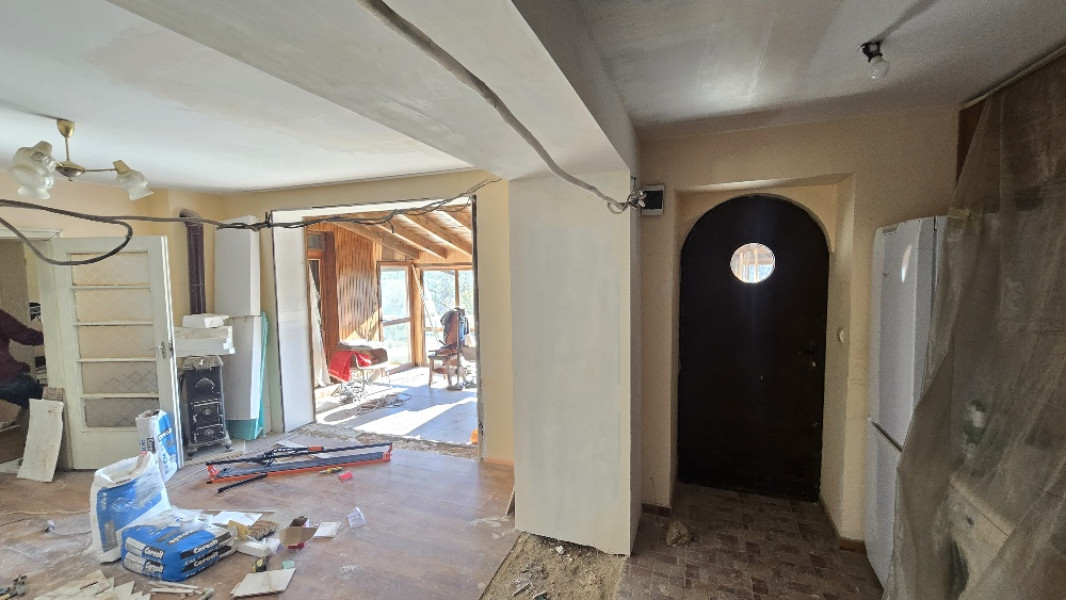 Building company Varaks has started the renovation works of this house in Kavarna by removal of the plasterboard wall between the kitchen and living room and demolition of a stone wall between the kitchen and the living room. Support beams have been fitted to sstrengthen the opening between the kitchen and the living room. The construction workers begin the renovation of the shower room with demolition of the wall between the old toilet and shower room and brick up the old shower room door. The wall has been partially demolished and an opening for the new door is being built. The wall tiles in the shower room have been removed. The exterior construction and renovation works begin with cleaning of the old stone masonry, primer and fit thermal insulation on the external walls of the house.