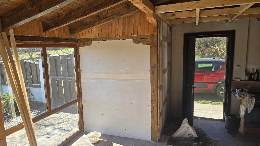 2) Rear facade wall – demolish and make an opening for a door, supply and fit support beams, Supply and lay contact primer, thermal insulation, supply and plaster (including fibermesh), supply and lay deep penatrating primer, supply and lay mineral plaster, supply and fit scaffolding;