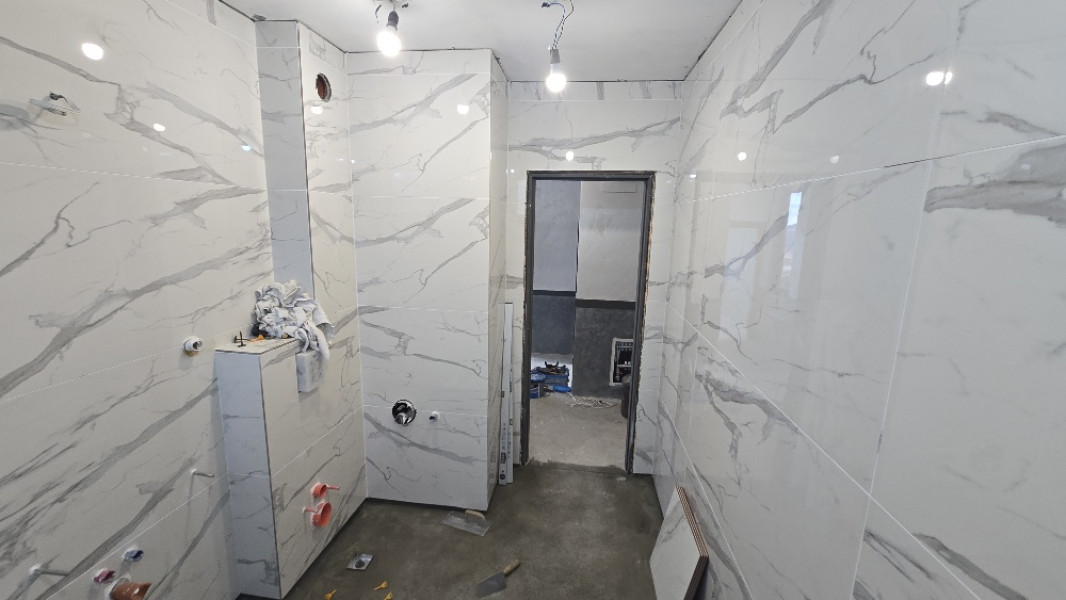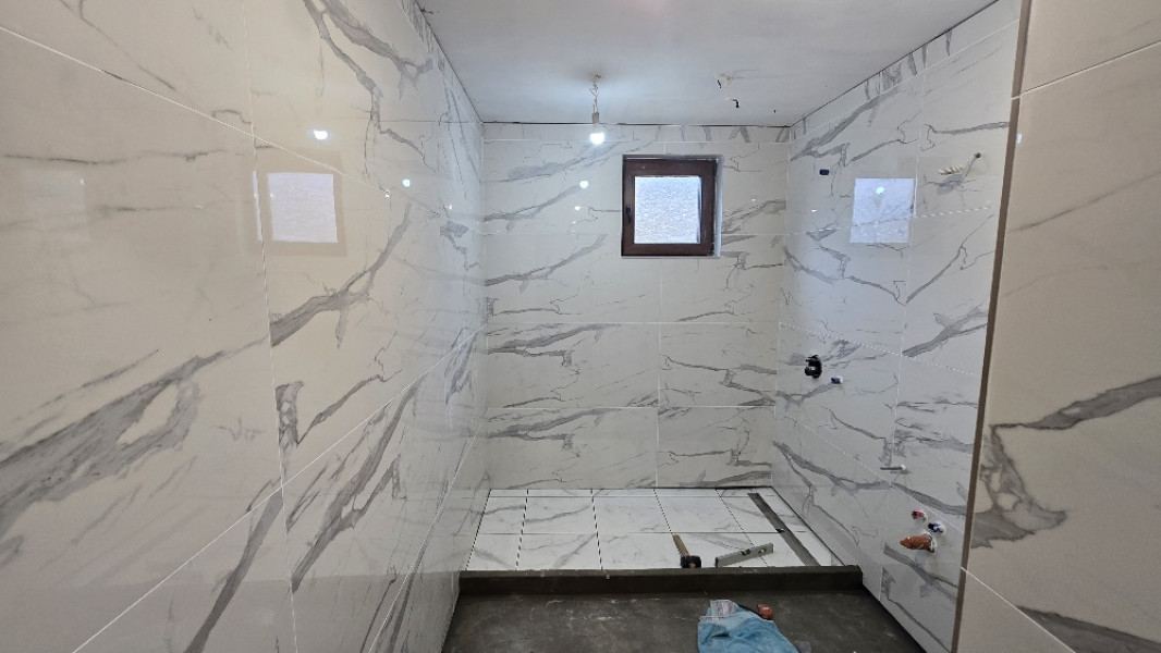 Строителна фирма "Варакс" продължава строителните работи по тази къща до Балчик с цялостна направа на банята. Положени са фаянс и теракот. Инсталирани са аксесоари за баня, шкаф-мивка, тоалетна, смесител за мивка, огледало, осветление, линеен сифон и душ. Монтирано е ново ел.табло с предпазители и дефектнотокова защита. Строителните работници разтоварват гранитогреса за кухнята, след което предстои полагането му.