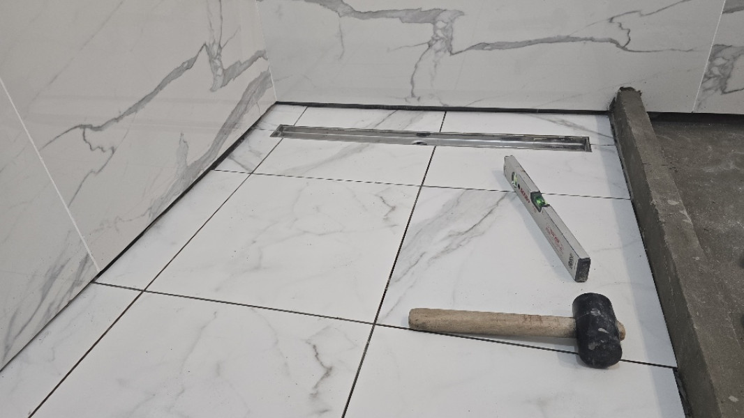 Строителните работници от строителна компания Варакс продължават строежа на къщата в Рогачево с полагане на гранитогрес във втората баня. Монтиран е линеен сифон в душ-зоната. В коридора и всекидневната са монтирани декоративни корнизи. Продължава полагането на хастарна мазилка по фасадата.