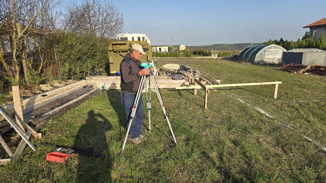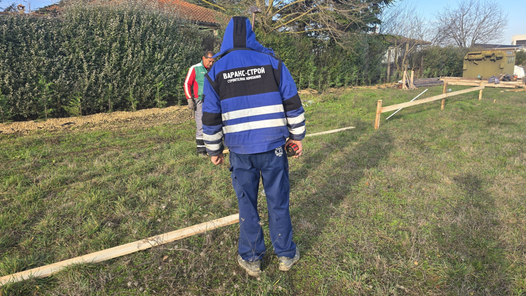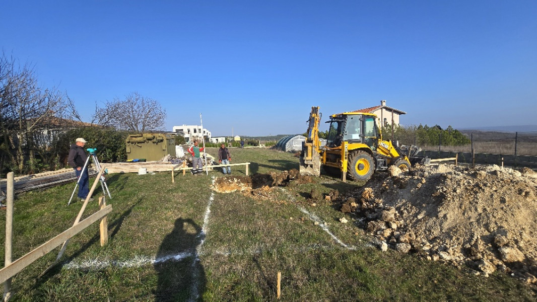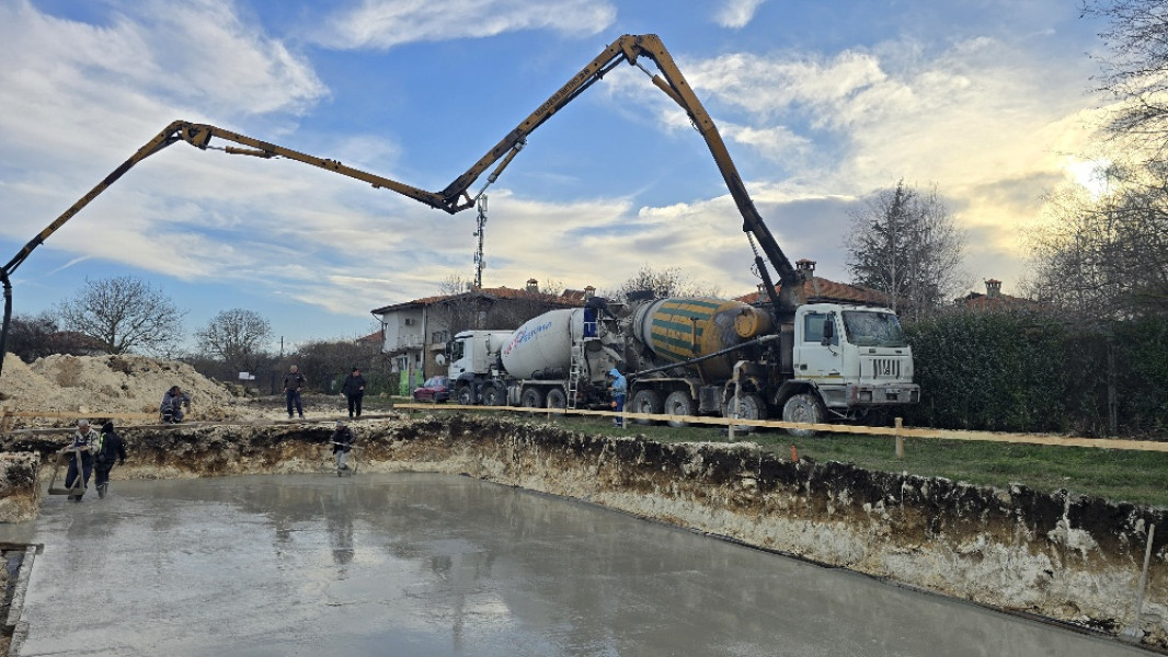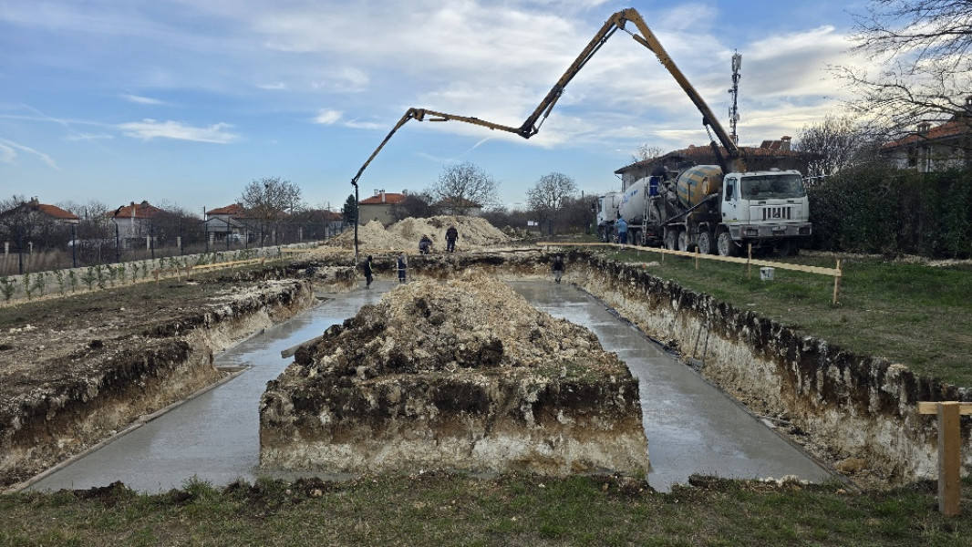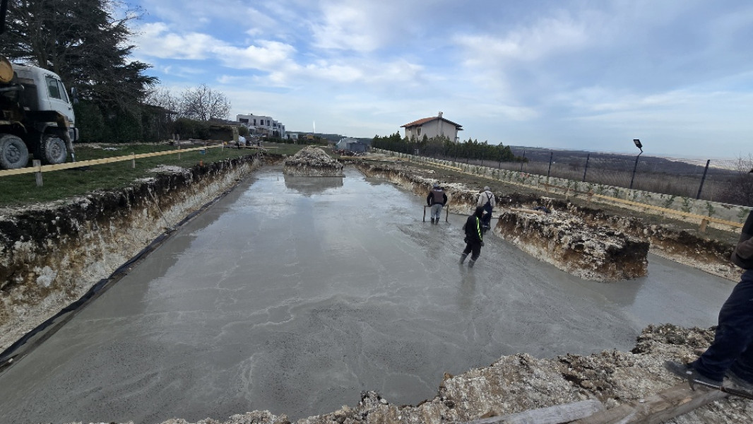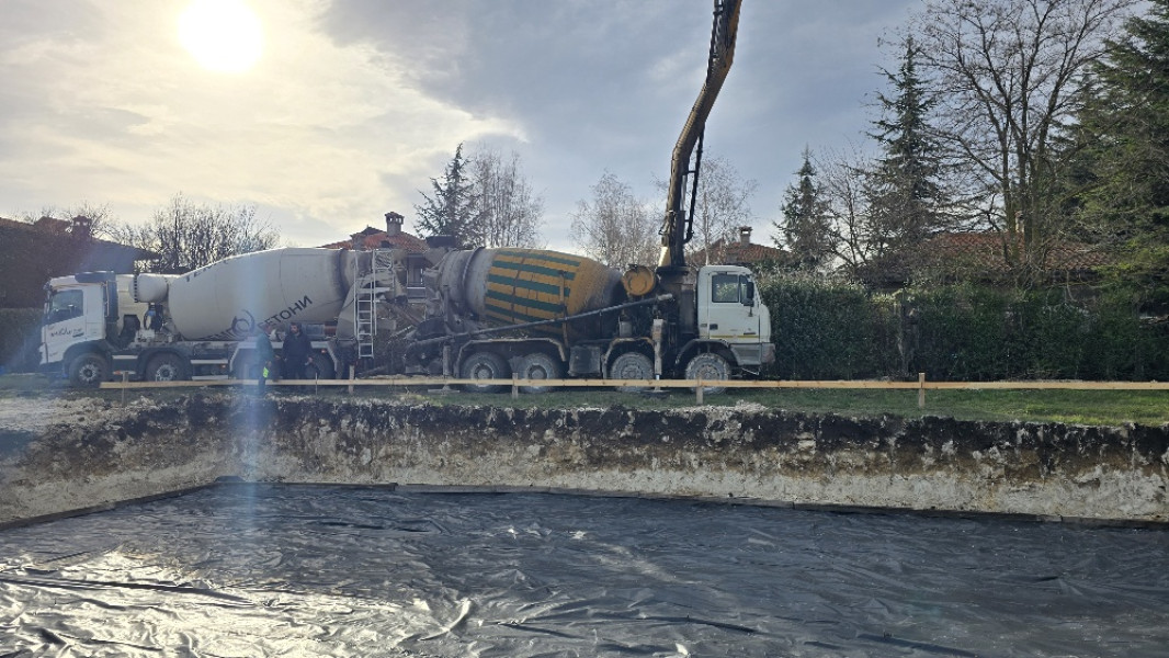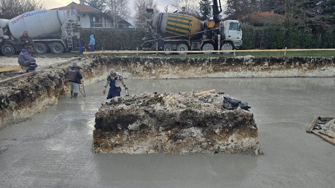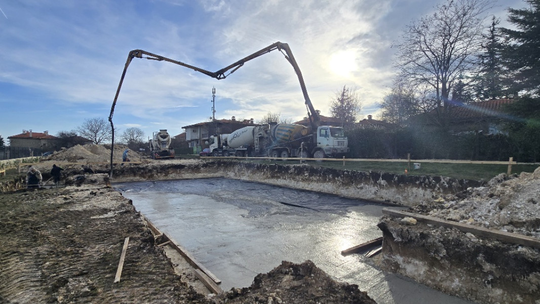 Строителният процес по изграждането на еднофамилната къща във Варна започва с прецизно разчертаване на сградата и задаване на необходимите нива за коти. След проведените подготвителни дейности е извършен механизиран изкоп за основи. Строителните работници ръчно оформиха изкопа за постигане на точни размери и стабилност, след което положиха полиетиленово фолио преди подложния бетон. При полагането на подложния бетон специалистите от строителна фирма „Варакс“ извършиха внимателно изравняване и заглаждане на повърхността, осигурявайки качествена основа за следващите етапи на строителството.